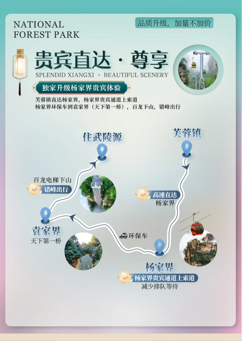 2、森林公园内景点与景点之间全是用景区内的环保车提供服务,并非一个团一个专车,而且一个团有可能不能坐同一辆环保车前往下一下景点,景区游人众多,请一定要在导游指定的地点汇合,不能走散,更不要将随身所带物品遗失在环保车上;旺季游人众多,排队情况时有发生,敬请谅解;