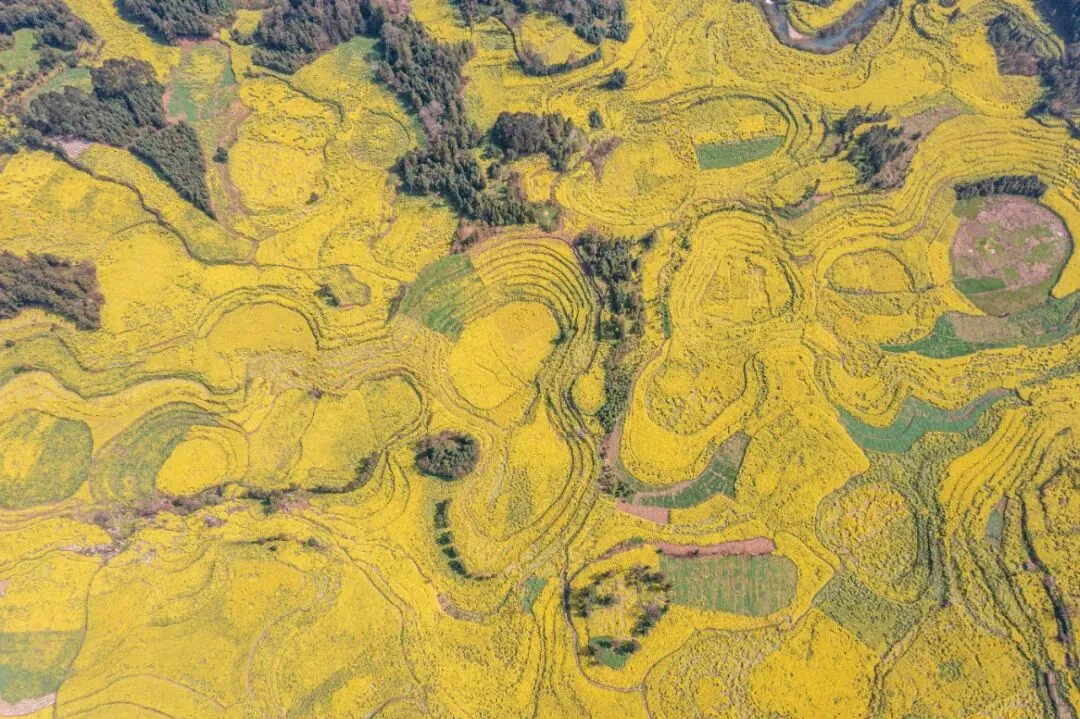 螺丝田,是著名的赏油菜花好去处,成片向上延伸的梯田开满了油菜花,远远望去就像螺丝的纹路,一圈又一圈,又像是无数金龙盘卧,层层叠叠,置身其中,满目金黄,十分治愈。