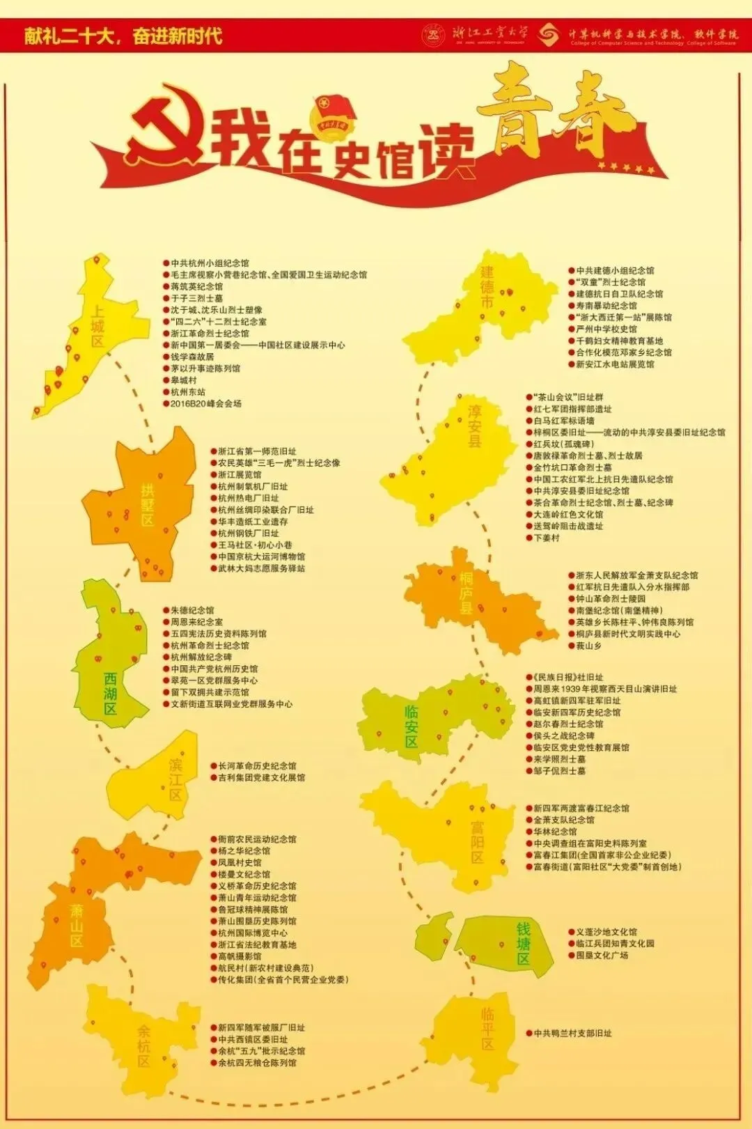 浙江工业大学计算机学院党委借此中国共产党第二十次全国代表大会胜利召开之际,特开展“献礼二十大,奋进新时代”系列活动之“我在史馆读青春”红色景点学习打卡活动,深入贯彻学习二十大精神,组织学院全体师生党支部追寻红色足迹,走进红色史馆,通过红色记忆探究时代发展,激励师生勇担新使命与新要求,青春助力浙江“两个先行”。