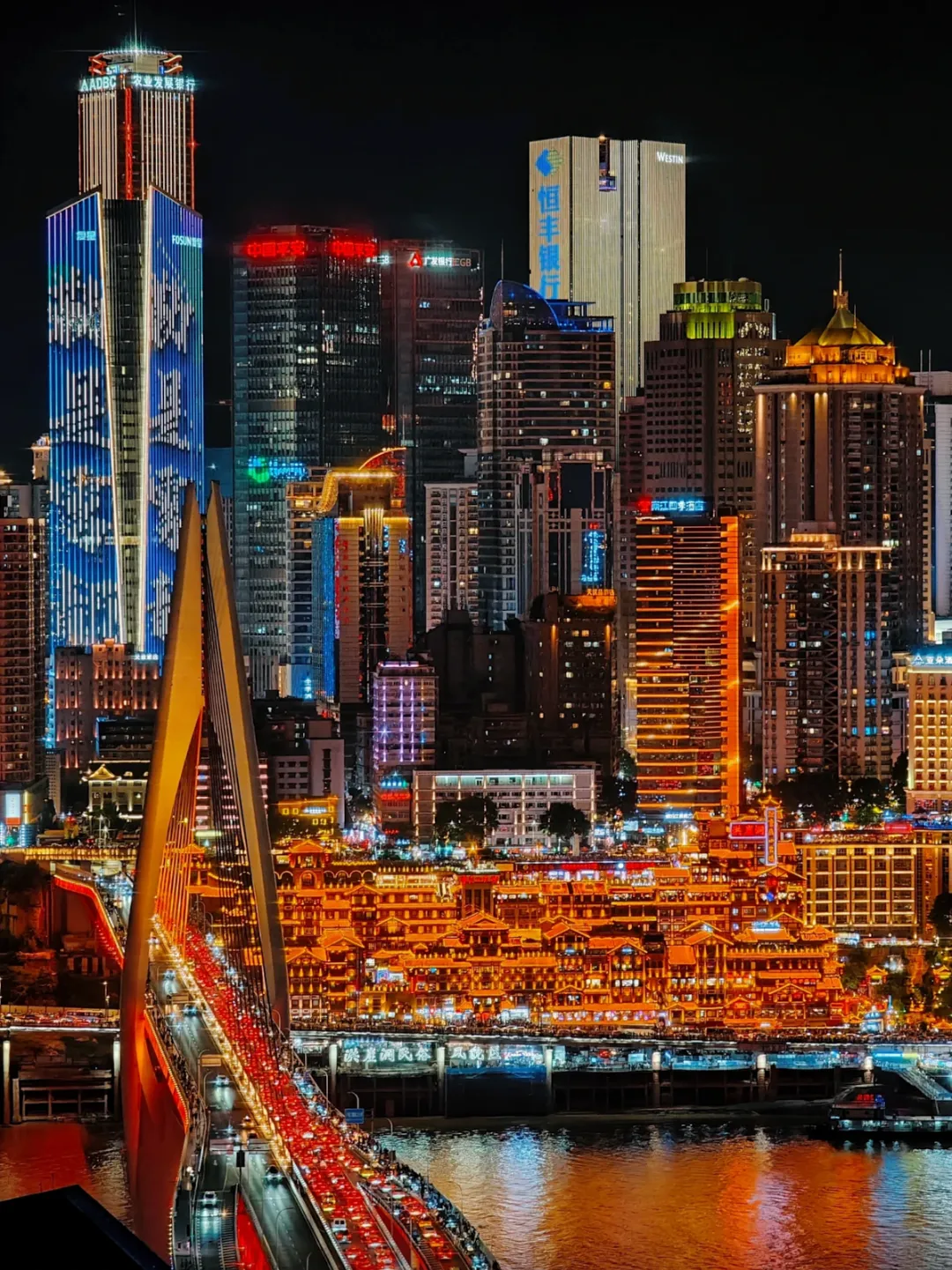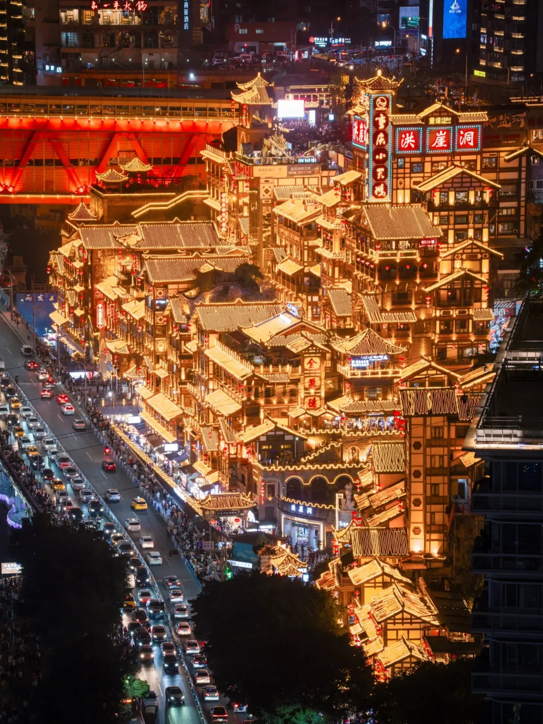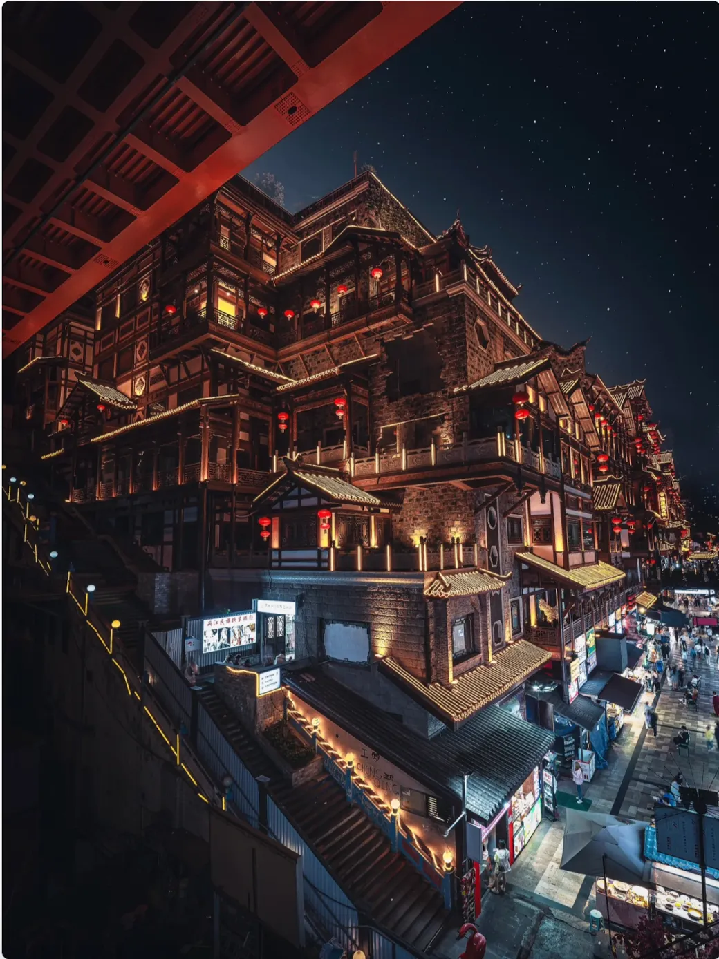 依崖而建的巴渝吊脚楼群,夜晚灯火璀璨如现实版《千与千寻》。