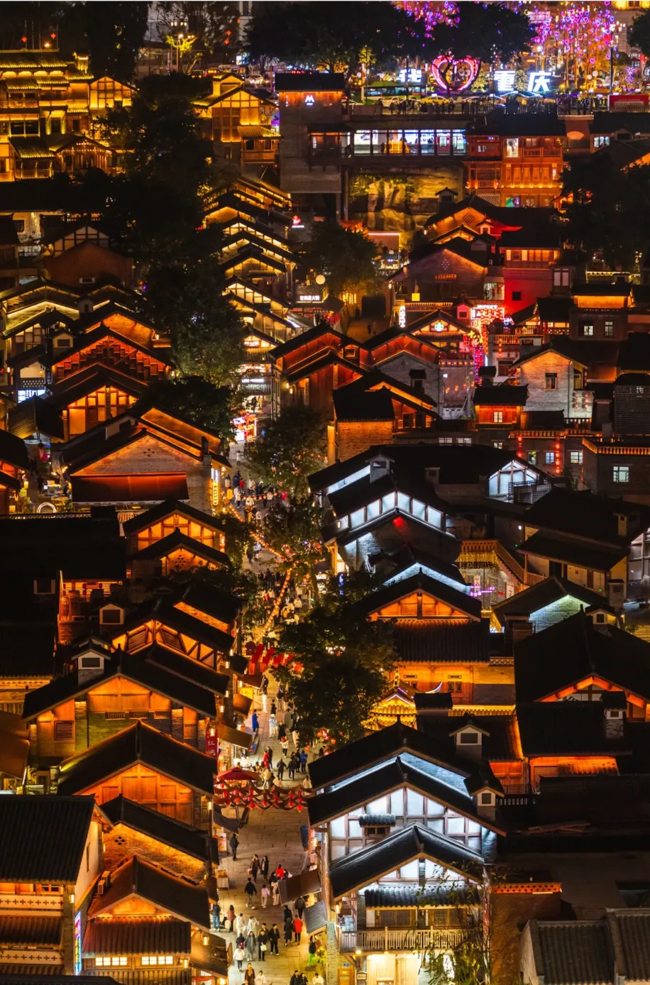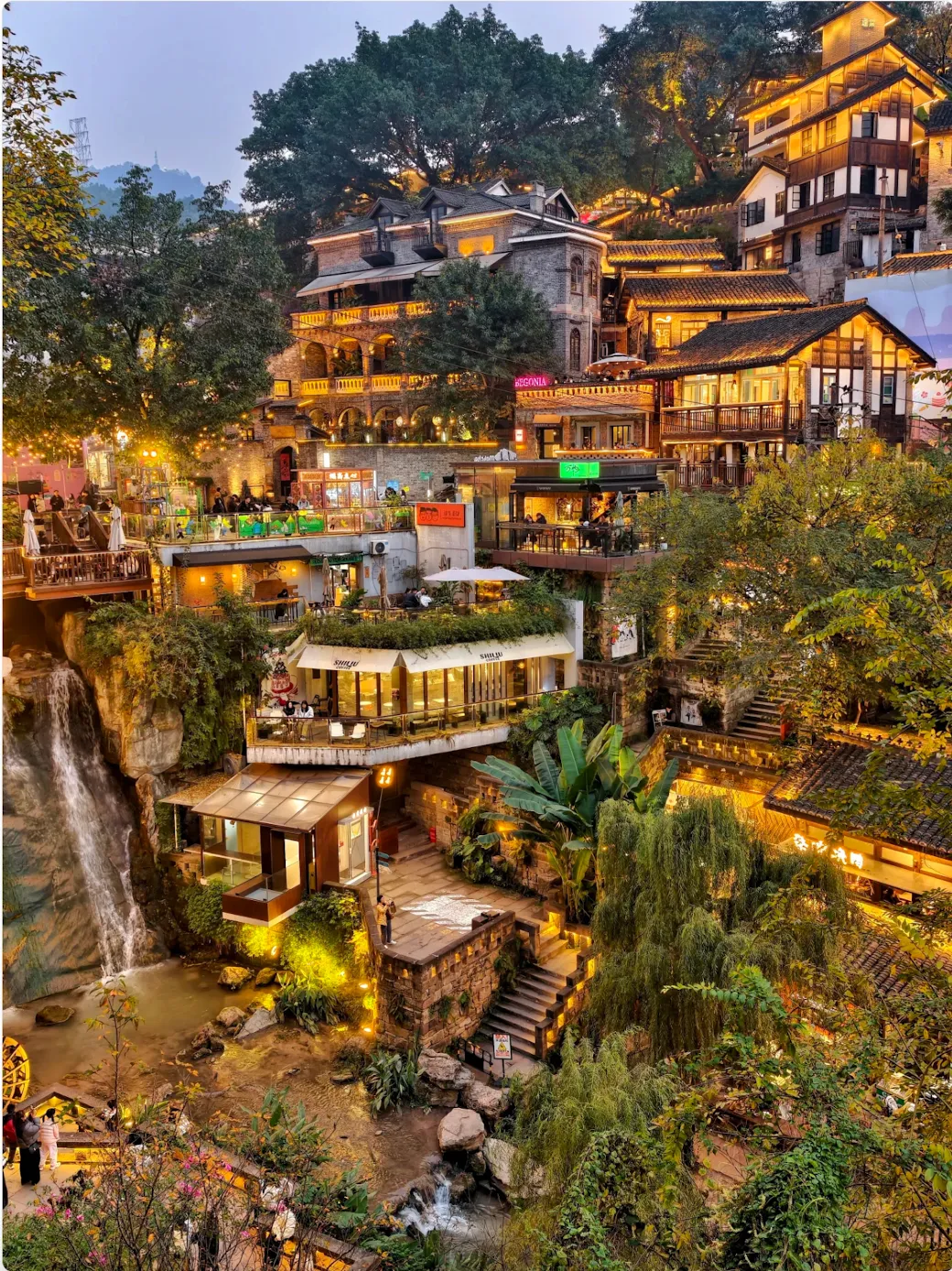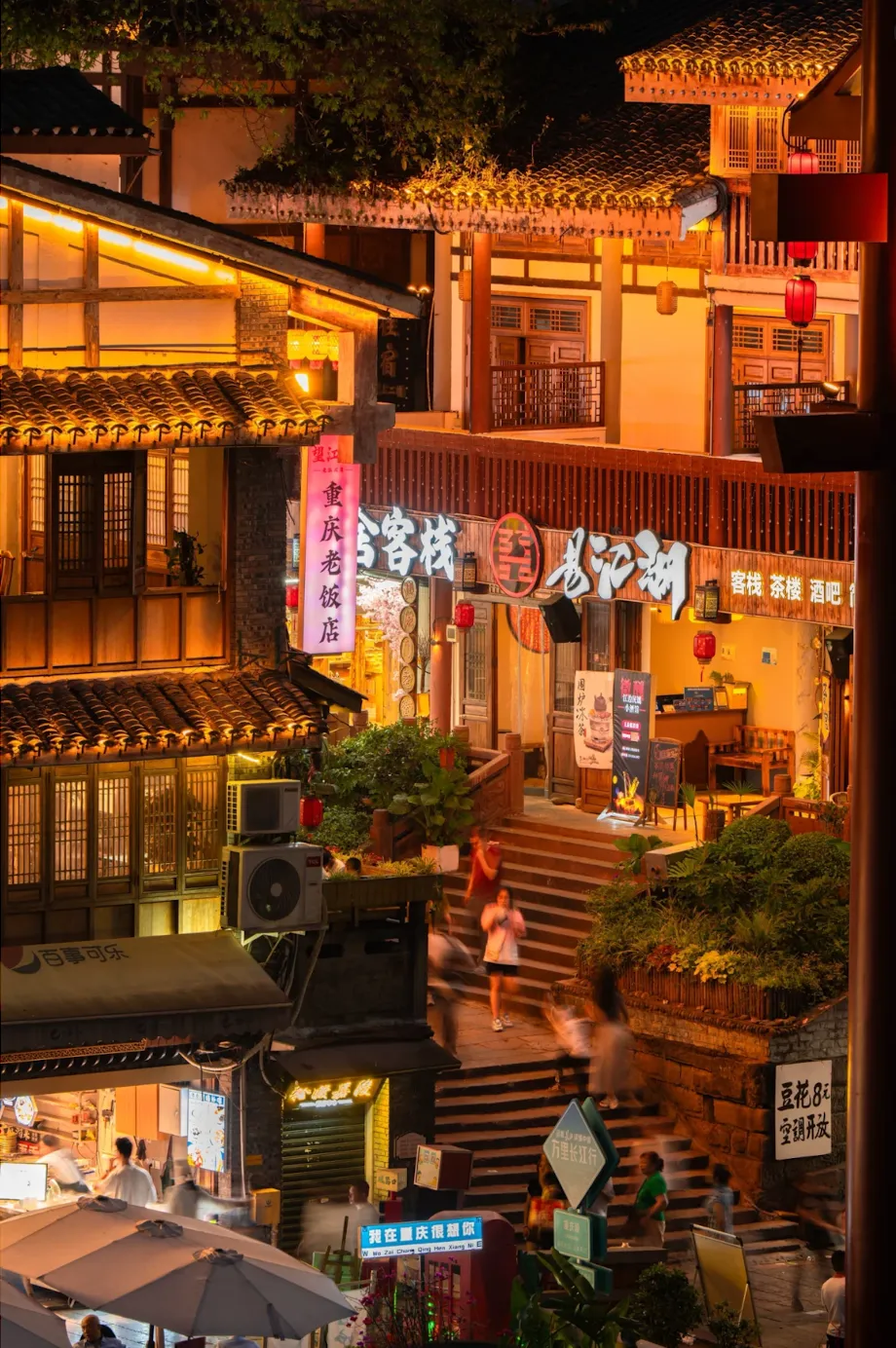 依崖而建的巴渝吊脚楼群,夜晚灯火璀璨如现实版《千与千寻》。
