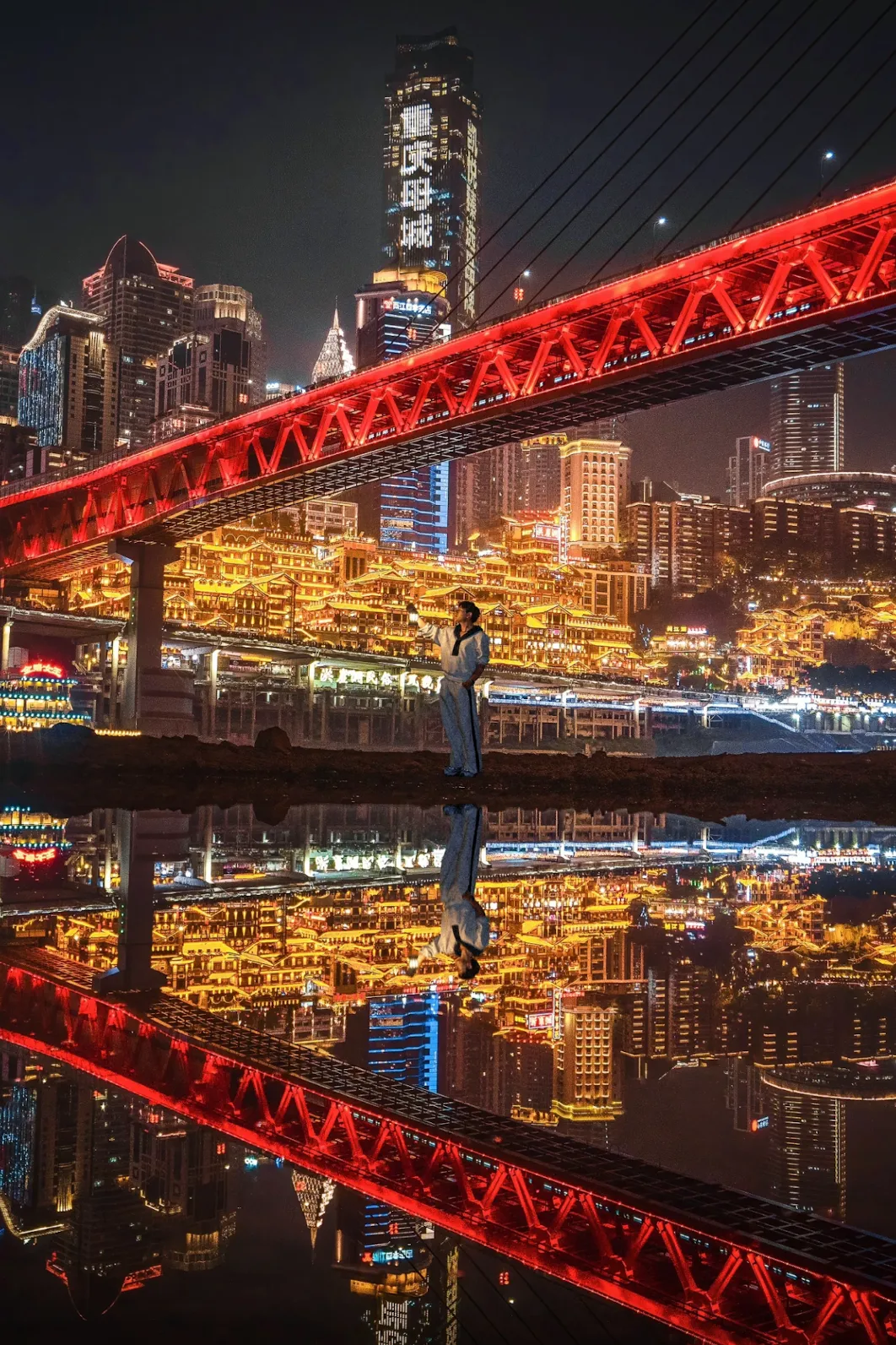 横跨嘉陵江的红色斜拉桥,桥上是观洪崖洞与江景的绝佳视角。