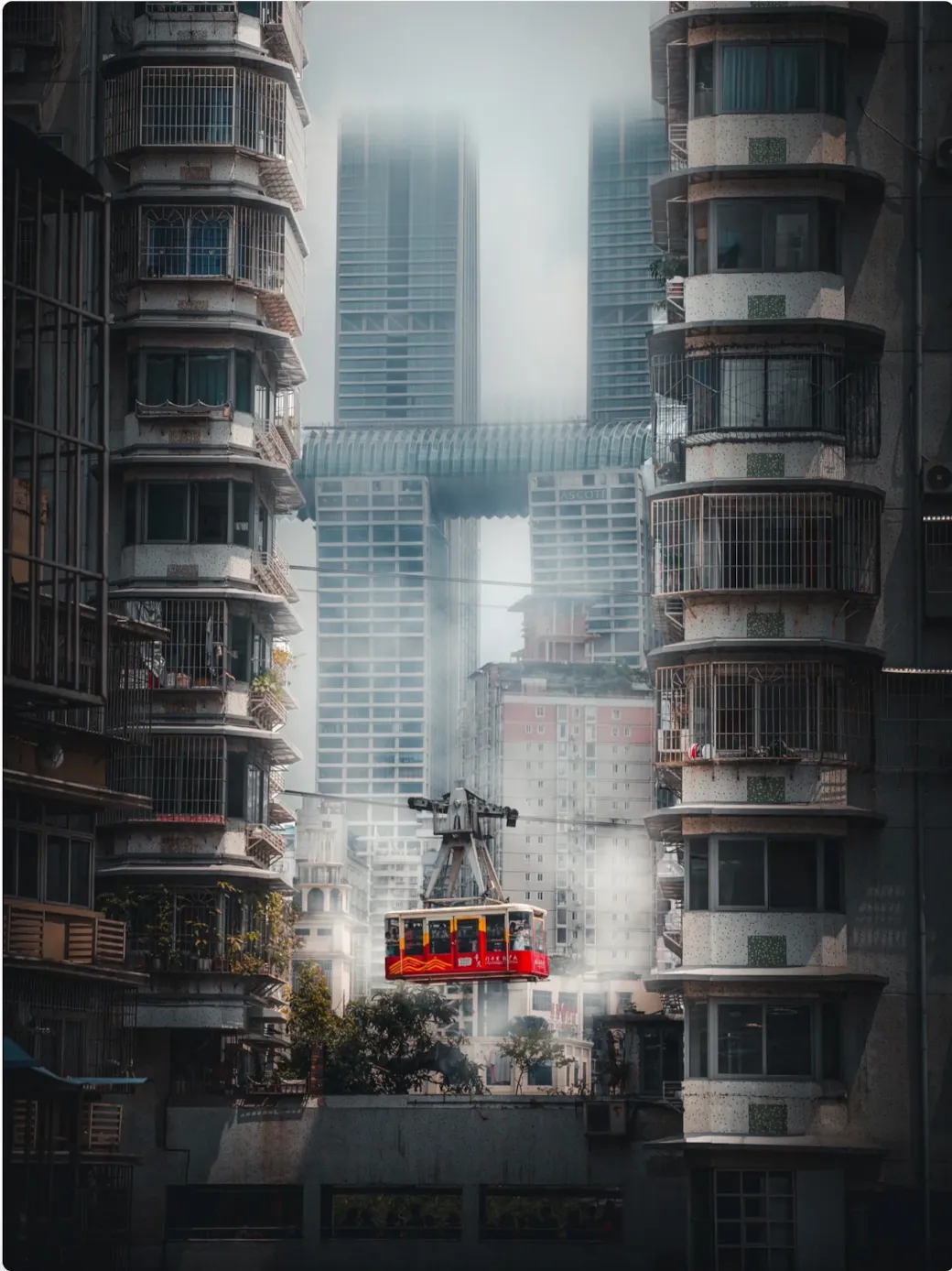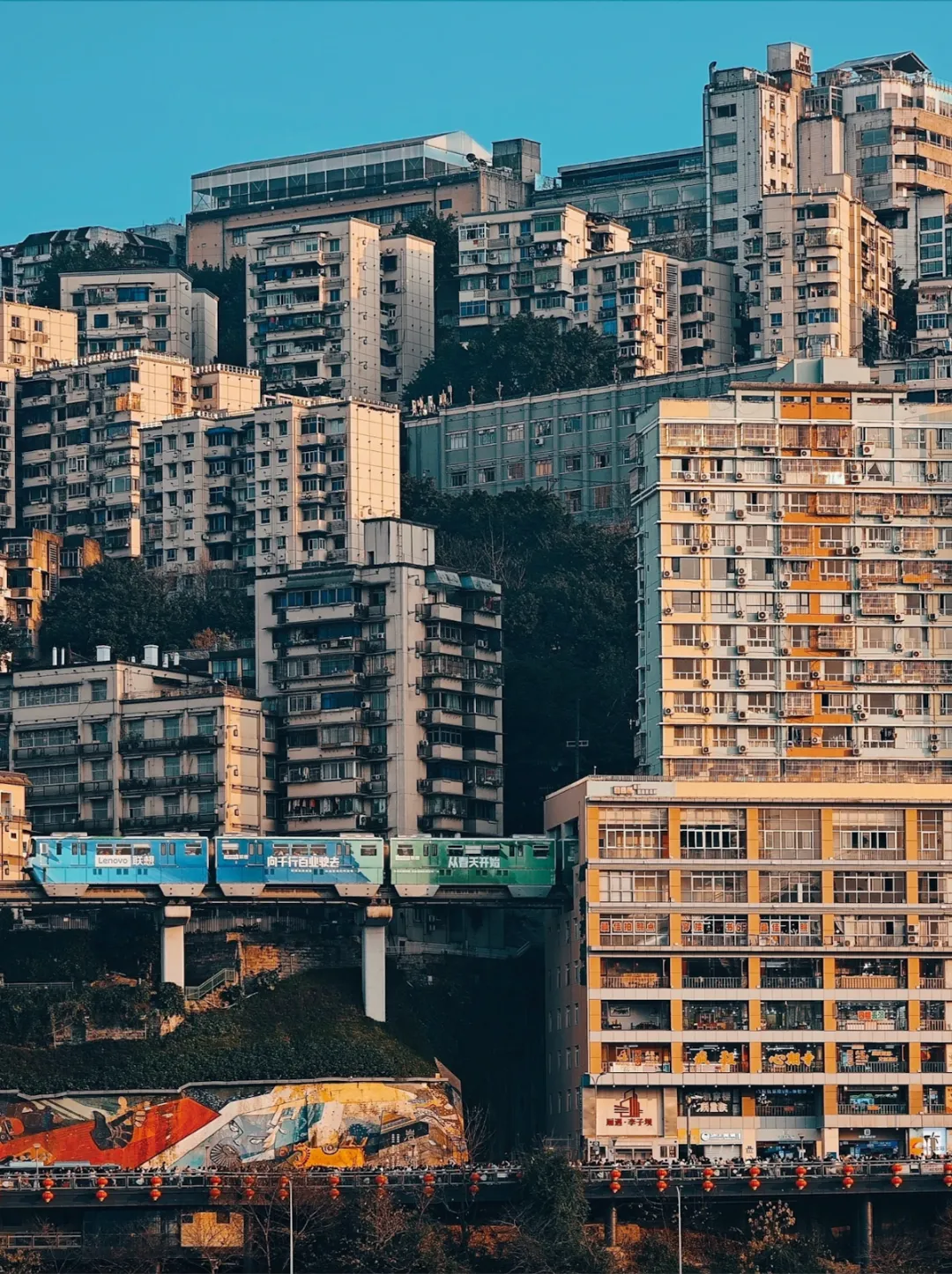 轻轨穿楼奇观的诞生地,仰望列车划过居民楼的魔幻瞬间。