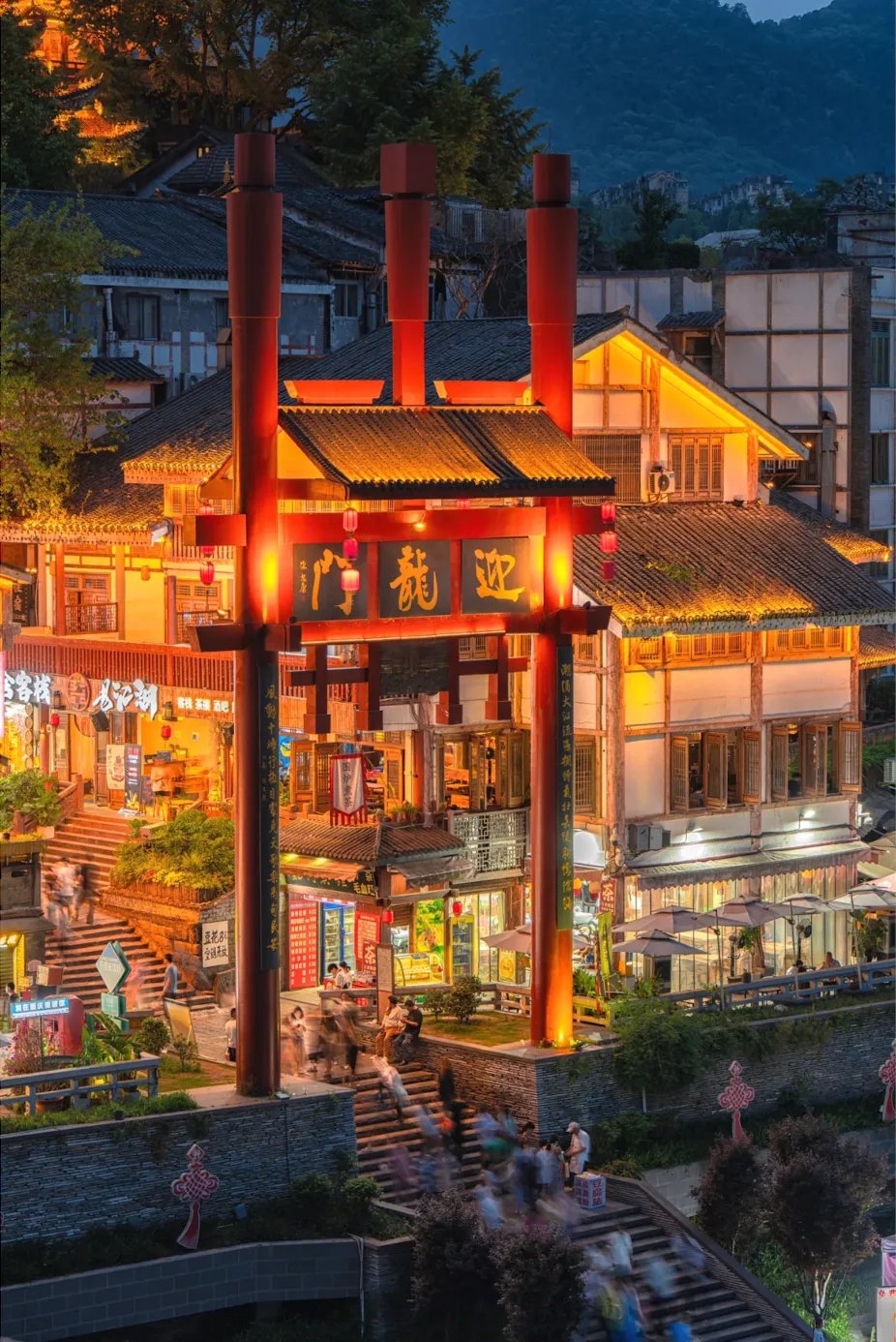 Blue stone steps connect century-old Western-style buildings, with the Dongshuimen Bridge framing the view like a giant landscape painting.