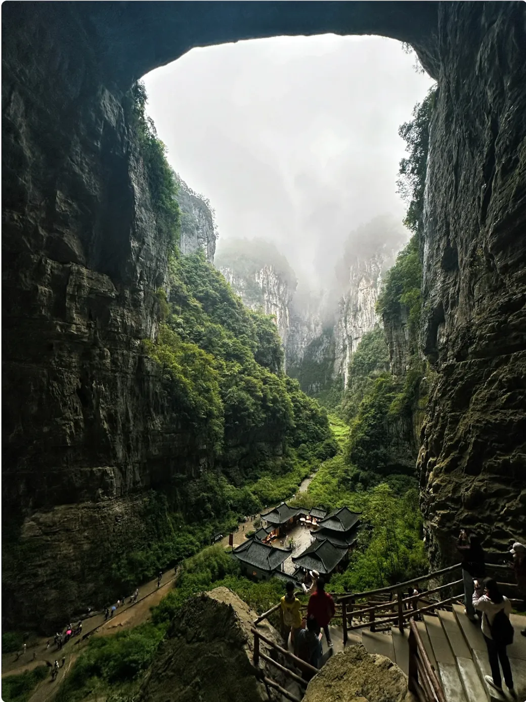 The cloud bridge hangs above the thousand-meter-high cliff, while the stone pillar river and the clear water lake reflect the geological wonders.