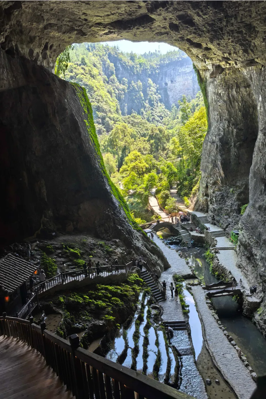 云端廊桥悬于千米绝壁,石笋河与清水湖映照地质奇观。