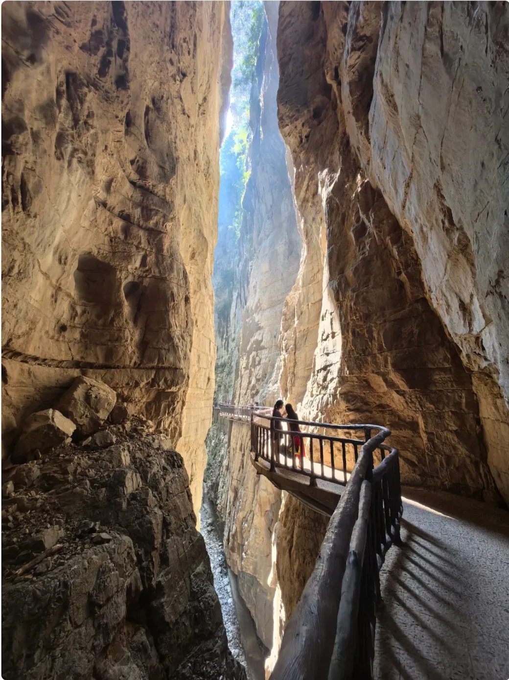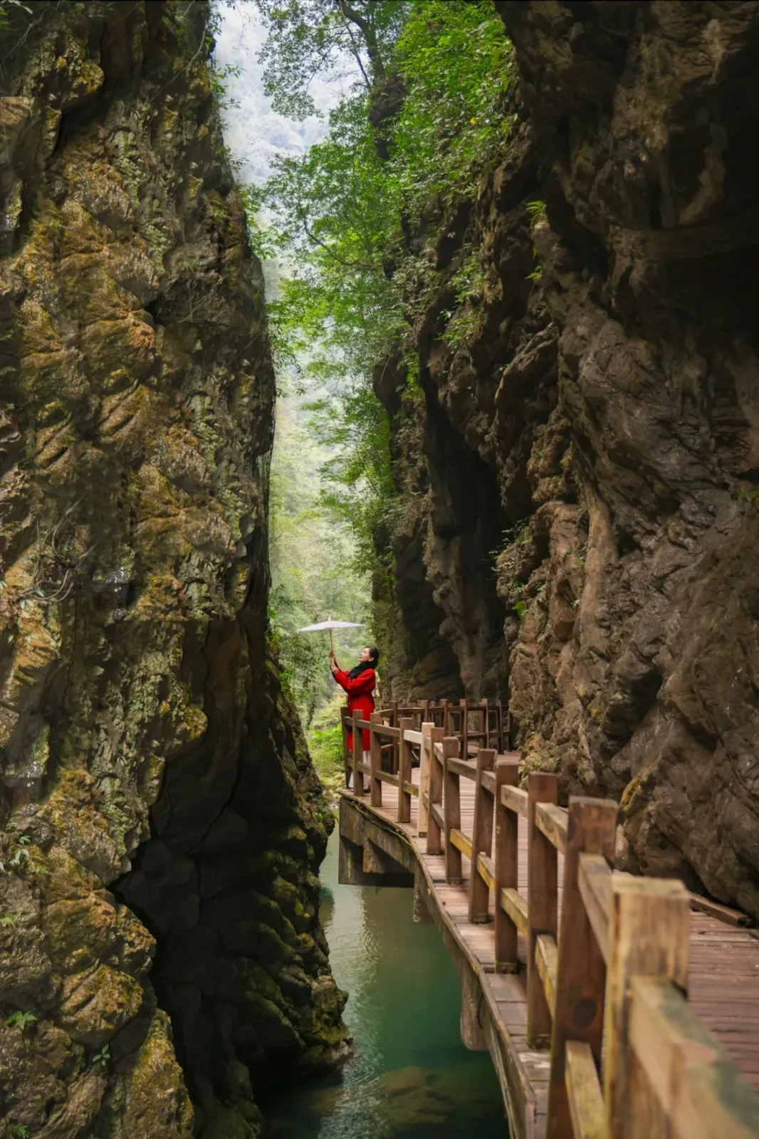A riverside plank walk along the cliff, connecting old city gates and the lanes of Shancheng Alley, tracing the veins of local life.