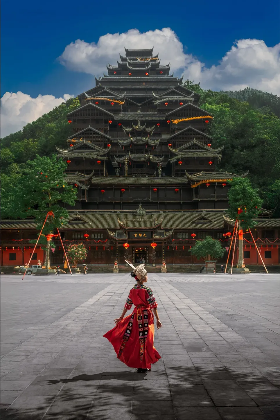 世界上最大的苗族吊脚楼建筑群,九黎神柱与蚩尤大殿巍峨耸立,彰显苗族始祖文化;每年盛大祭典与璀璨夜景,共同构筑一座穿越千年的苗文化精神家园。