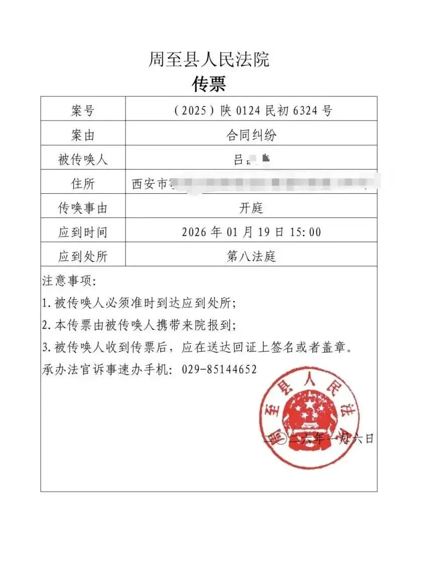 周至县人民法院传票显示,该案于2026年1月19日下午在周至县人民法院开庭审理。吕先生称,庭审中,景区负责人承认存在工作错误,同意退还门票款,但因财务流程要求,需待判决书出具后执行。