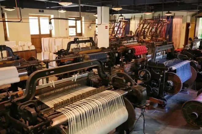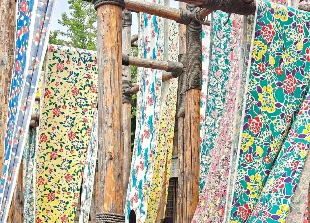布坊以孟家瑞蚨祥为发端,尽可能展示出孟家当年的商业铺陈。染坊内有现尚存完好的精美的染印镂空雕花板等用具,院子里是晾晒区。孟家染坊的庭院悬满靛蓝花布,阳光穿透镂空雕版投下孔雀纹的光斑。