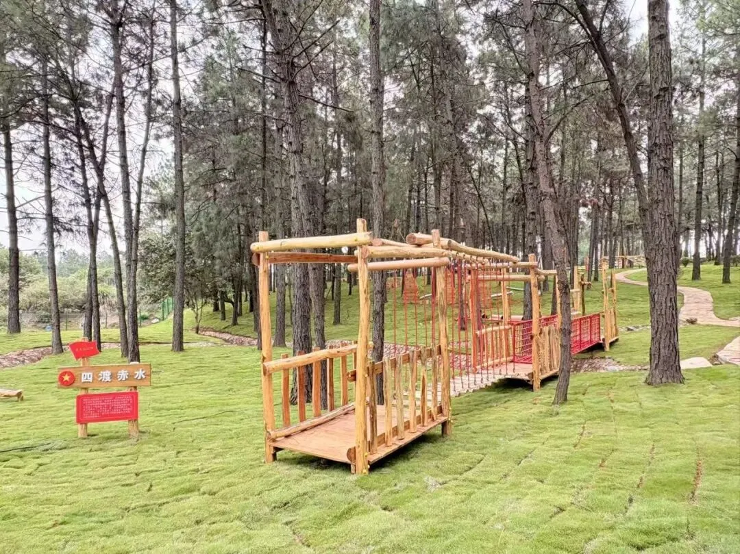 丛林重走长征路素质拓展体验区:依托山林自然地貌,还原“爬雪山”“过草地”“飞夺泸定桥”等经典革命场景,学员通过徒步穿越、障碍挑战等实景体验,沉浸式感悟长征路上的艰辛与革命先辈的坚韧意志。