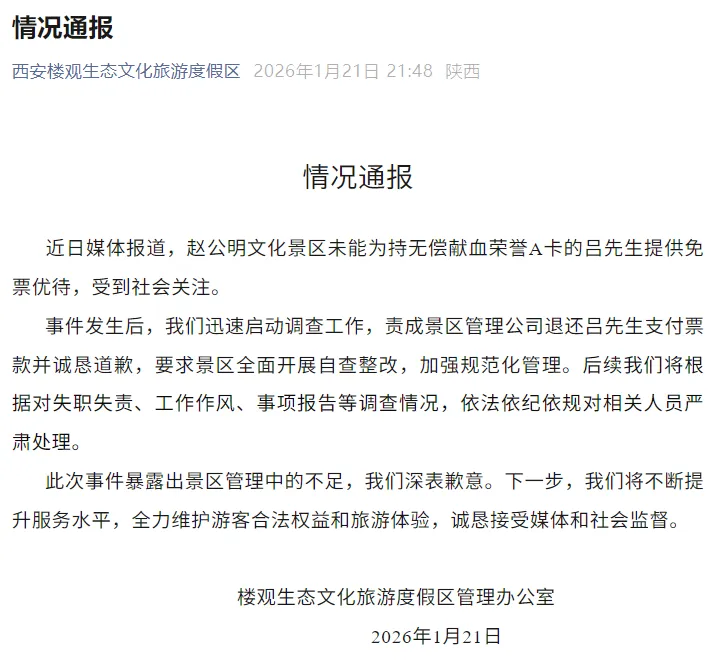 通报称,近日媒体报道,赵公明文化景区未能为持无偿献血荣誉A卡的吕先生提供免票优待,受到社会关注。