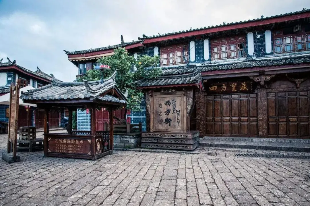 登楼远眺,整座丽江古城的青瓦灰墙铺展开来,与远处的玉龙雪山相映成画,日出、日落时分光影变幻,是摄影爱好者的绝佳取景地。门票31元左右,建议避开正午人群,午后或傍晚前往,既能享受微凉山风,又能捕捉最美全景。 作为古城的心脏地带,四方街以广场为中心,向四周辐射出四条街巷,明清以来便是茶马古道上的商贸枢纽,如今依旧是古城最热闹的地方。清朝史料曾记载这里“日中为市,午聚酉散,无日不集”,脚下的五花石板路被马帮的马蹄磨得光滑,每一道纹路都藏着当年的商贸传奇。