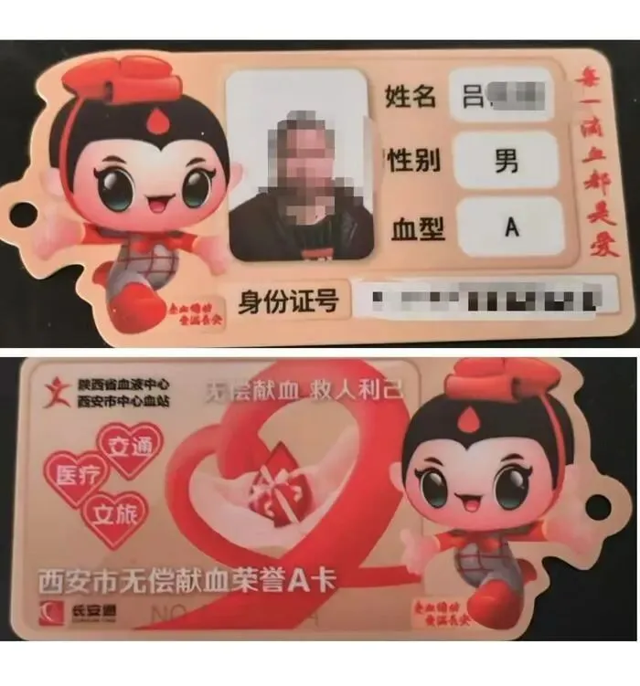 据吕先生介绍及其提供的相关证明显示,2025年9月中旬,在其累计献血57次献血总量达到22600毫升后,获得了“西安市无偿献血荣誉A卡”,该A卡正面显示有吕先生的个人照片、姓名、性别、血型等,背面则标注有“西安市无偿献血荣誉A卡”等字样。