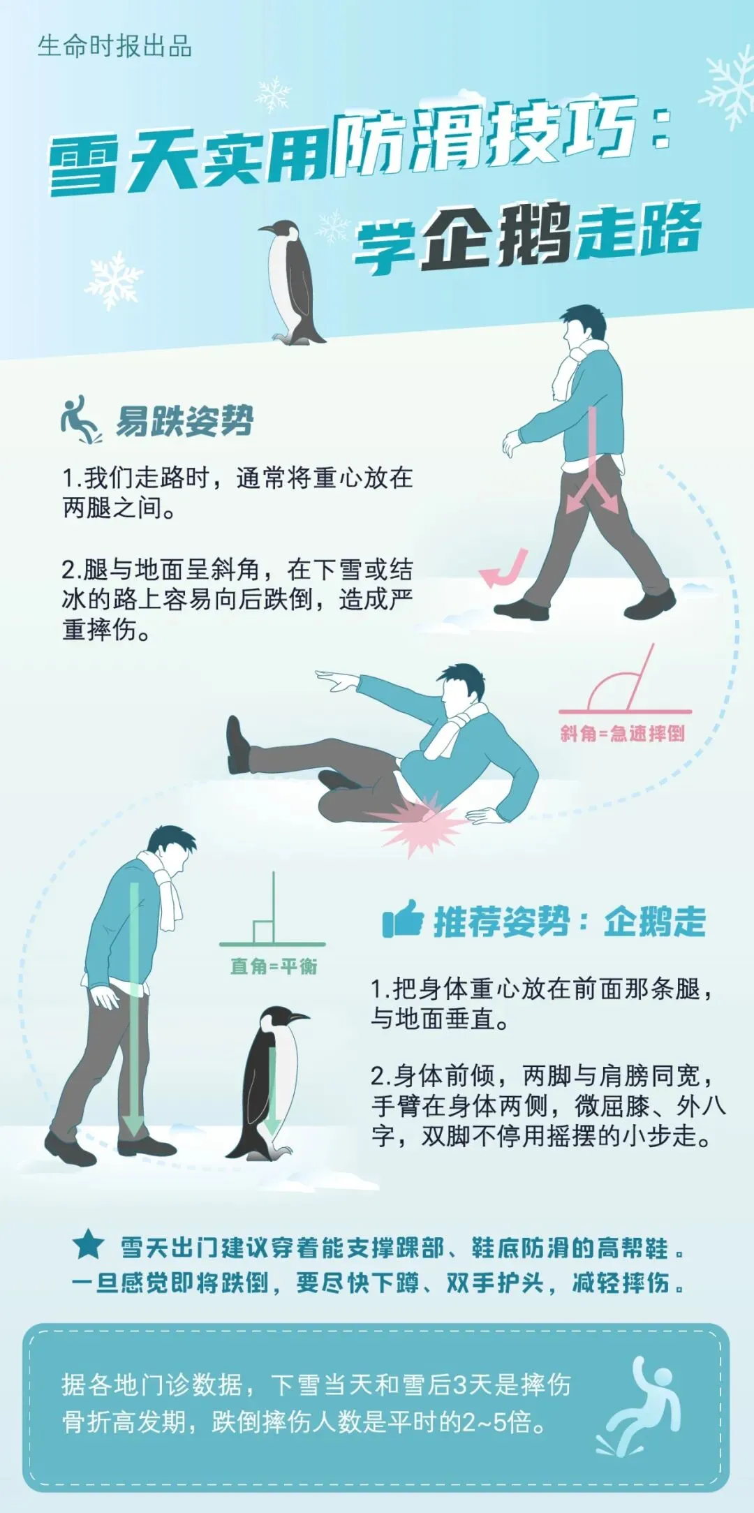 比如等红绿灯时,从停止状态迈出的“第一步”是最易滑倒的。另外,速度变快或变慢也会让身体平衡改变,所以雪天走路最好保持匀速。