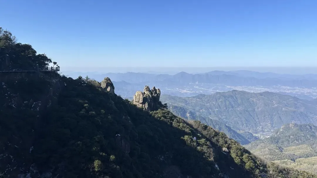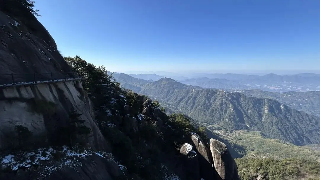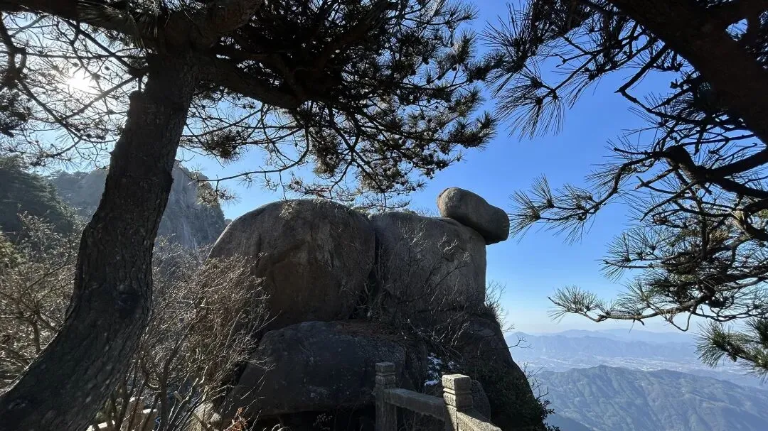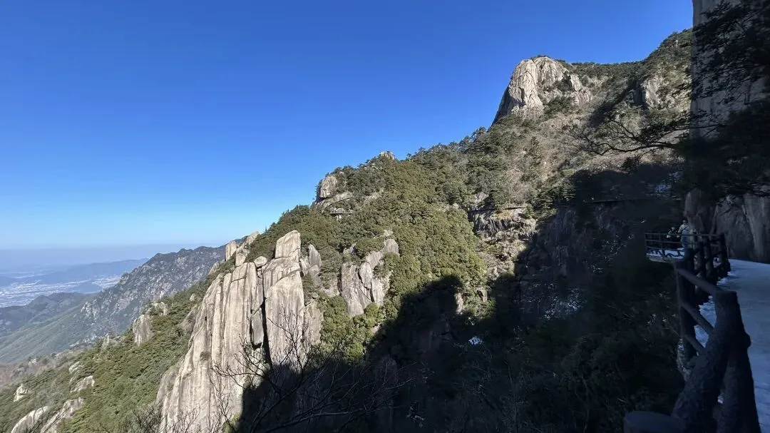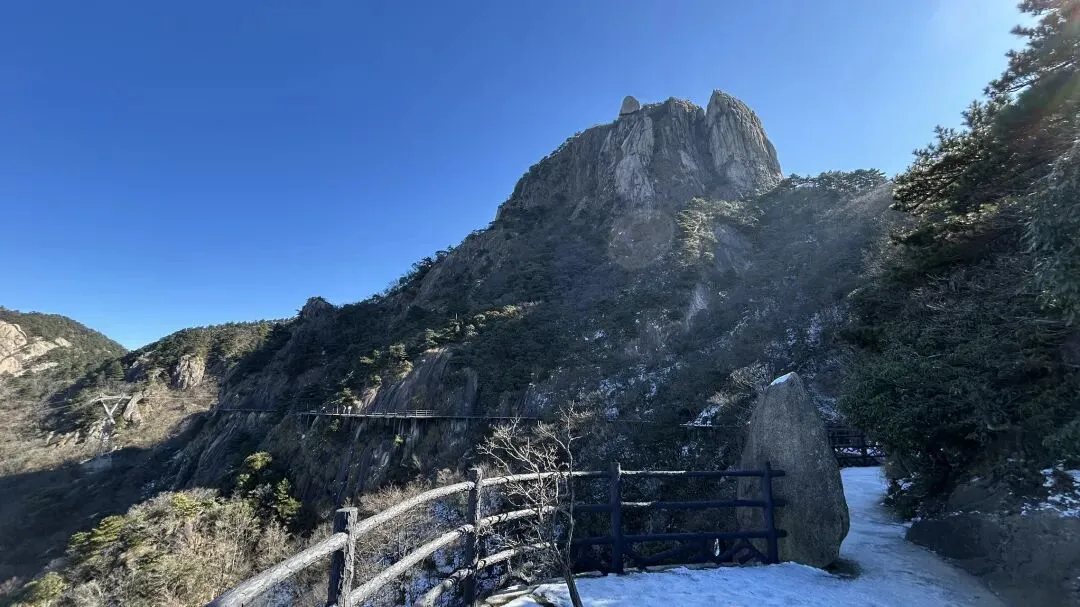 我是从12/28号从潜山坐7:35分的高铁到达安庆,到达时间是8:04分,然后由安庆坐坐9:18分的高铁到九华山站,到达时间是9:51分. 在高铁上旁边座位是一个年轻的西安小伙,他和我一样去九华山旅游.他是出差途中,抽空去九华山转转,就半天多时间.他目标明确,步行登上大天台,下来索道,如果还有时间的话再看看一两个寺庙. 大家一起出站,本来AA滴滴费用,他说他能报销,不用A了. 大约半个小时到达九华山游客中心. 因为我的行程是先玩花台,住九华街,第二天再玩九华山.两人就此别过.九华山游客中心的服务非常之好,有服务人员主动问你打算去哪,告诉怎么坐车,到花台在哪里寄存行李,到哪买票,都給讲得明明白白. 坐滴滴时候,滴滴司机说了一句,“花台这个时间没什么看的,有花的时候才去花台”. 在游客中心,服务人员告诉我“花台雪还没有融化,可以去看雪”,“先去栈道看看然后决定是否登顶”. 我也就顺道给自己找了一个去花台的理由. 事实证明,花台风景也不差的,只是那个时间段去,缺少了花和秋叶.