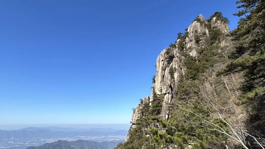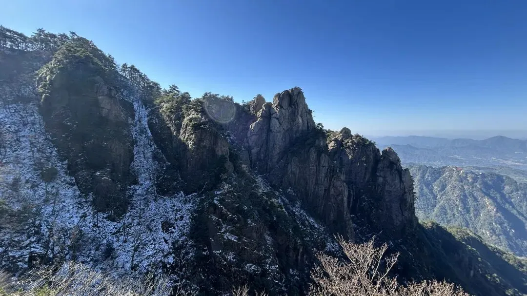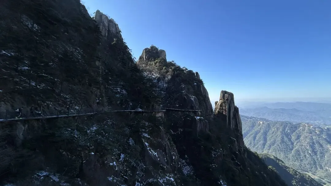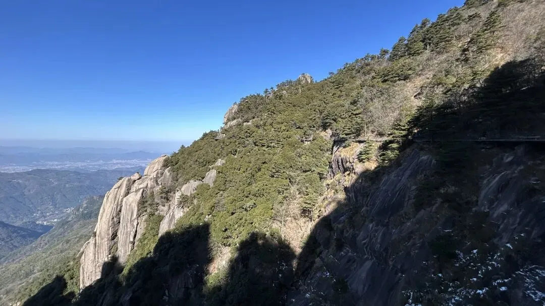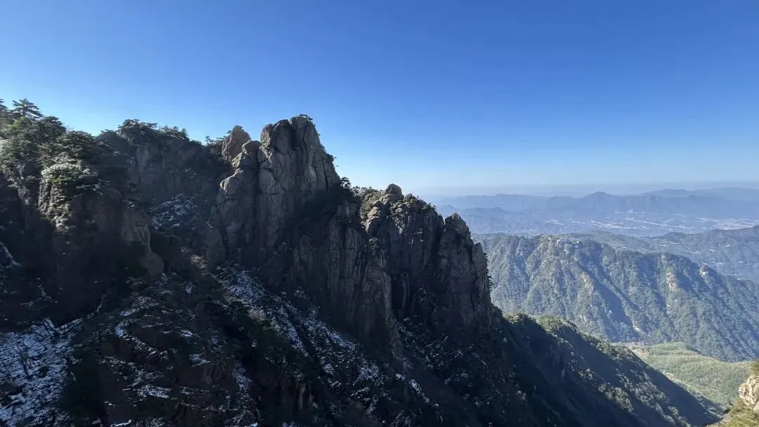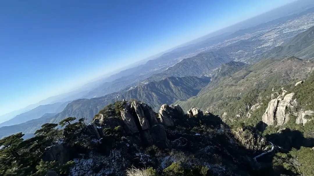 我是从12/28号从潜山坐7:35分的高铁到达安庆,到达时间是8:04分,然后由安庆坐坐9:18分的高铁到九华山站,到达时间是9:51分. 在高铁上旁边座位是一个年轻的西安小伙,他和我一样去九华山旅游.他是出差途中,抽空去九华山转转,就半天多时间.他目标明确,步行登上大天台,下来索道,如果还有时间的话再看看一两个寺庙. 大家一起出站,本来AA滴滴费用,他说他能报销,不用A了. 大约半个小时到达九华山游客中心. 因为我的行程是先玩花台,住九华街,第二天再玩九华山.两人就此别过.九华山游客中心的服务非常之好,有服务人员主动问你打算去哪,告诉怎么坐车,到花台在哪里寄存行李,到哪买票,都給讲得明明白白. 坐滴滴时候,滴滴司机说了一句,“花台这个时间没什么看的,有花的时候才去花台”. 在游客中心,服务人员告诉我“花台雪还没有融化,可以去看雪”,“先去栈道看看然后决定是否登顶”. 我也就顺道给自己找了一个去花台的理由. 事实证明,花台风景也不差的,只是那个时间段去,缺少了花和秋叶.