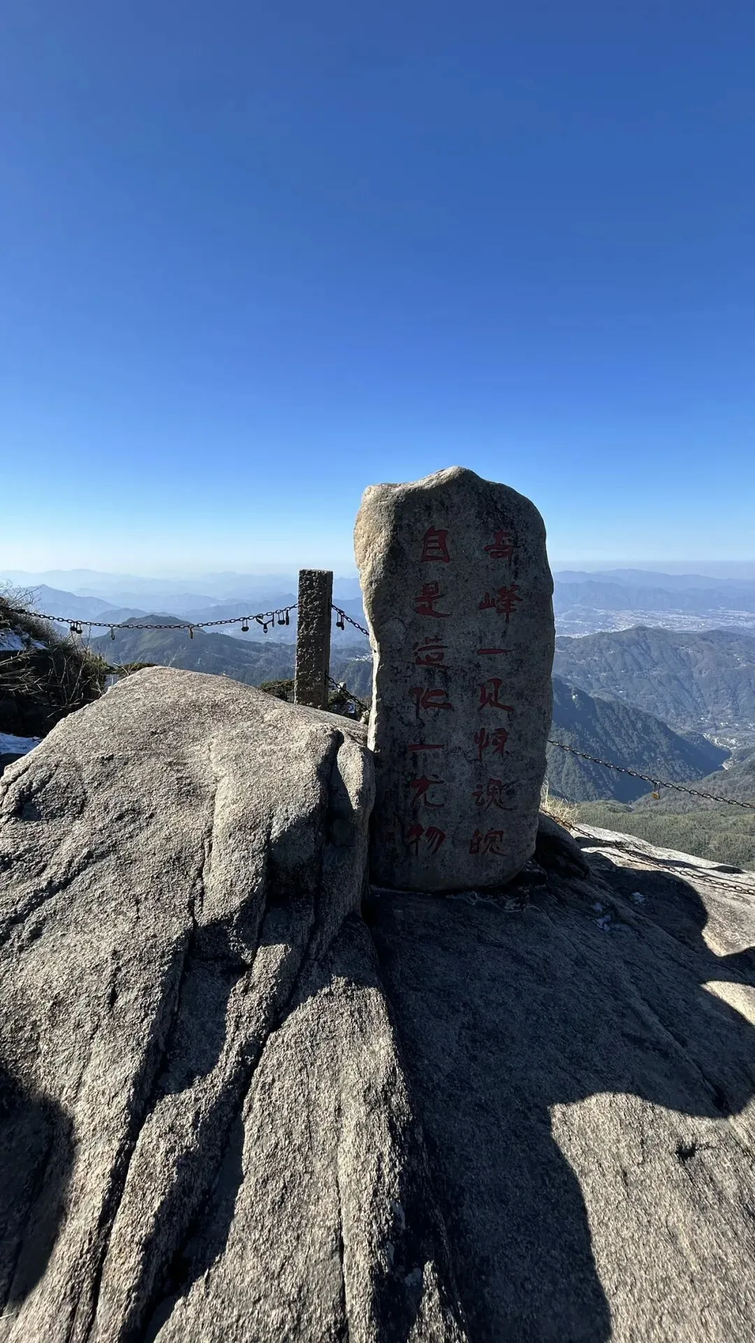 经过了比较长时间的爬石阶梯后,发现膝盖也不怎么特别疼了,比昨天登天柱山西线情况好一些.只有2-3个上下坡就登顶了花台. 比较轻松,只有一段下石梯的时候有残雪,需要一步一脚的抓紧铁索侧着身子挪下去.