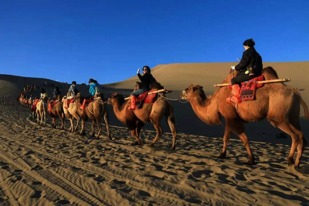 在甘肃敦煌,鸣沙山月牙泉景区又现“骆驼大队”;