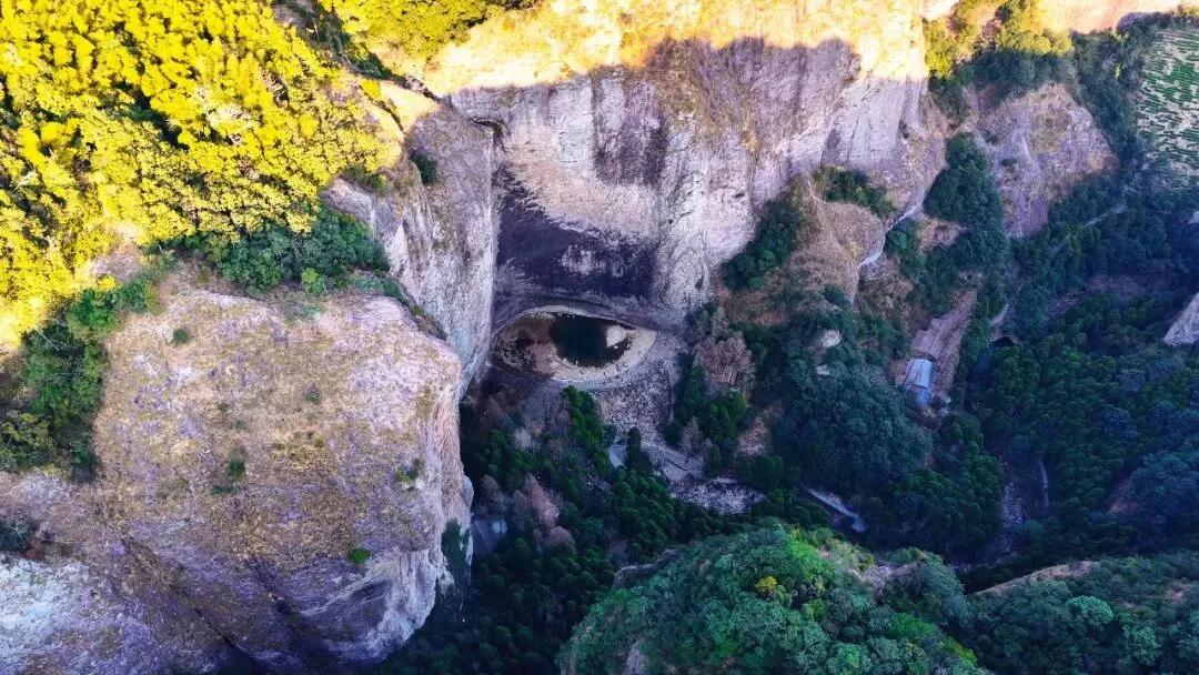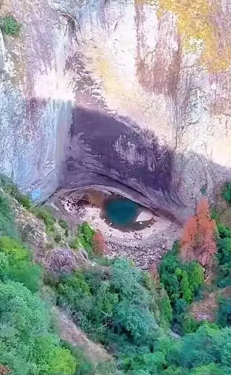 从视频画面可见,这只“龙眼”整体轮廓清晰:潭中央残留的深绿色水域宛如深邃的“瞳孔”,周围浅米色与灰褐色岩壁构成了“眼白”,上方深色岩石凹陷则形似“上眼睑”褶皱,还能看到清晰的“双眼皮”,整只“眼睛”镶嵌在灰白色崖壁底部,与下方深绿树林形成鲜明对比,更显生动立体。