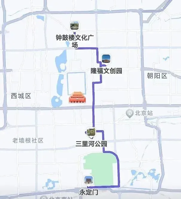 线路简介:以北京中轴线为主线,将钟鼓楼、隆福寺文创园、前门三里河公园、颜料会馆、永定门御道遗存等标志性点位串珠成线。学生和家长以此线路开展亲子研学,壮美中轴线的万千气象一览无余。