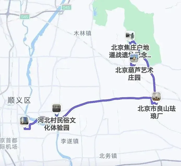 线路简介:顺义区选取顺义区文化中心、焦庄户地道战遗址纪念馆、北京葫芦艺术庄园、河北村民俗文化体验园、北京市良山珐琅厂等点位推出“追寻历史 匠心传承”研学线路,学生可通过现场打卡、游历体验等开展非遗体验、爱国主义教育等社会实践活动。