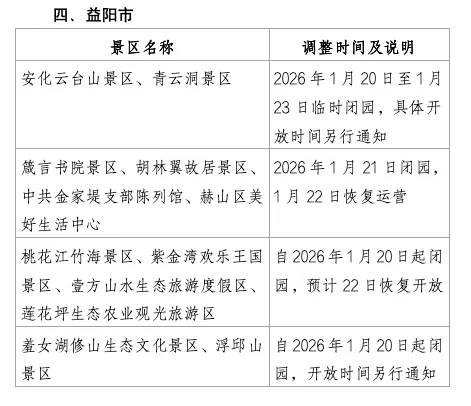 您现在的位置是:首页 > 国内旅游目的推荐 > 正文 国内旅游目的推荐 今起,湖南多个临时关闭的景区将陆续开放! admin2026年01月22日 08:52:45国内旅游目的推荐10 今起,湖南多个临时关闭的景区将陆续开放!受持续低温雨雪冰冻天气影响,为确保游客安全,湖南省内多地景区近日陆续发布临时闭园通知。截至1月21日,湖南多个市州的部分景区已采取闭园或调整开放时间措施。一些景区预计将于1月22日至23日前后逐步恢复开放,具体时间请游客密切关注景区官方通知。提醒广大游客合理安排行程,注意出行安全。景区名单内容来源:红网、湖南交通频道说明:版权归原作者所有如文章内容、图片、字体有侵权,请联系我们删除稿件合作请拨打:【客服电话:85392289】或添加合作微信:【微信号:mycs_0731】商务合作:【18975821393、15116303574 (电话微信同号)】猜你喜欢 转载请说明来源于"旅荐网",部分内容转载自网络,如有侵权请联系qlwl@foxmail.com删除 本文地址:https://www.15386.cn/post/84841.html 上一篇 #珠海旅游攻略 下一篇 慢慢觉得,旅游越来越没意思了 相关文章 假期打卡景区、游乐园?这份安全指南请收好→ 旅行热点:巴黎迪士尼新园保姆级攻略;上海迪士尼10岁生日庆典;《原神》空降北京环球影城 苏州旅游小白指南 泰安逛吃48小时旅游攻略 成都春季旅行攻略|花漾蓉城,慢享巴适 伊犁旅游全攻略:畅享美景与美食 出游攻略丨这么多的免签热门旅行地,是时候开启一段说走就走的旅程了 AI正在“杀死”旅游攻略?131万份深度报告揭示惊人真相 广东珠海旅行攻略+实用TIPS 西安八仙宫:旅游指南、主要传说、轶事、碑文 发表评论 取消回复 评论列表 这篇文章还没有收到评论,赶紧来抢沙发吧~