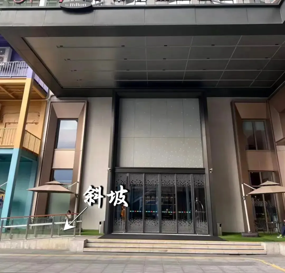酒店入口有无障碍通道,坡度平缓且有扶手,方便轮椅通行。