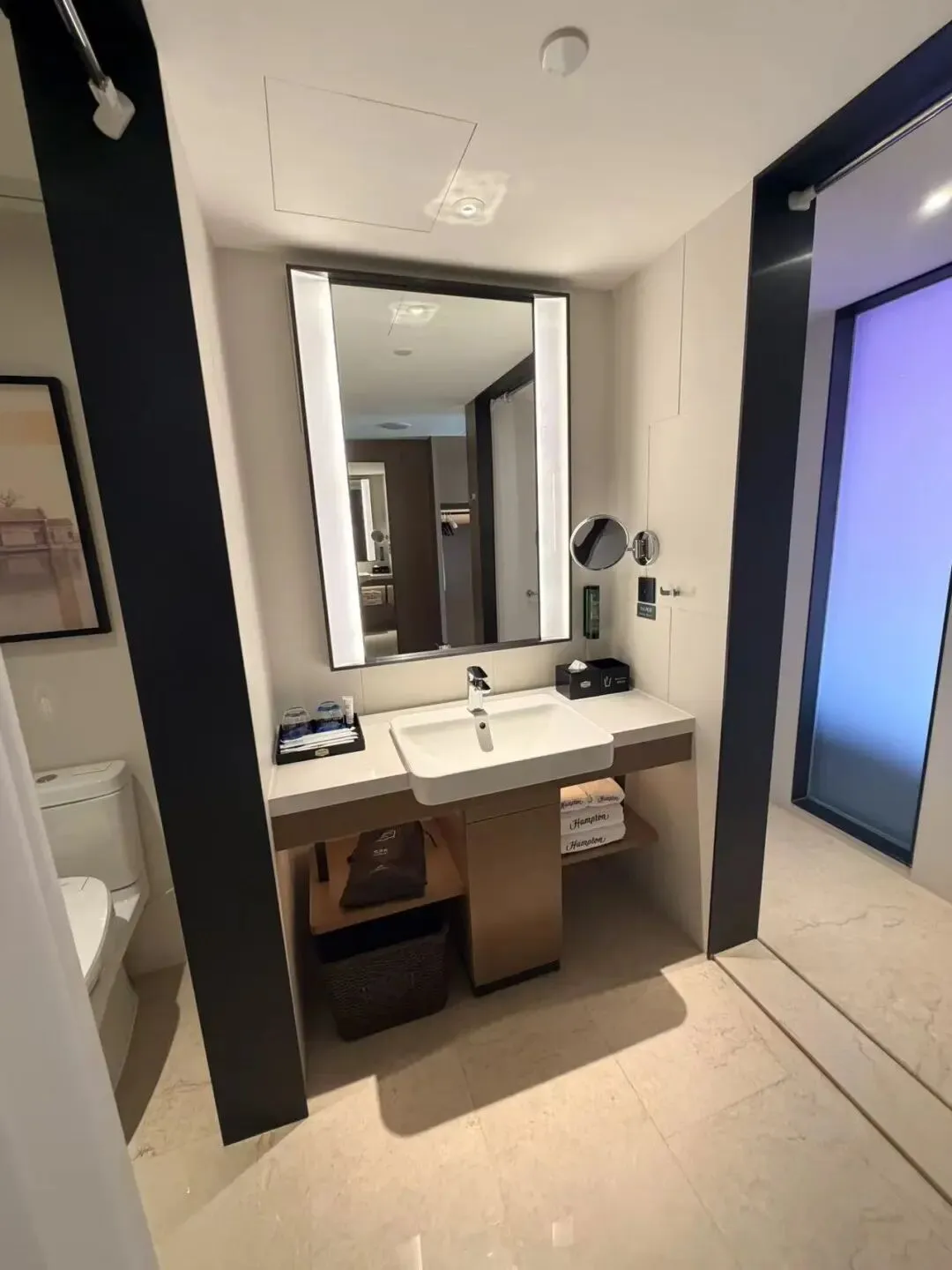 洗漱台面凸出,下方留有小部分空间容膝。