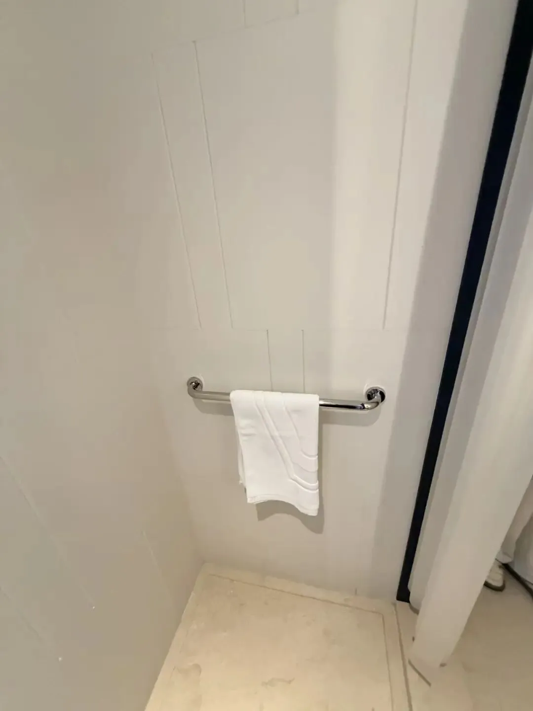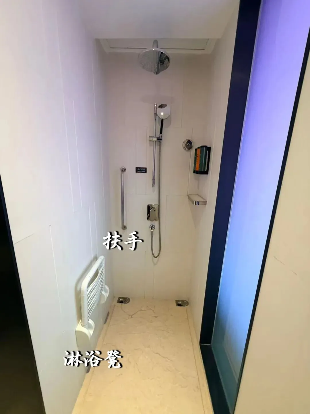 淋浴间地面平整,有扶手和淋浴凳,控制开关高度合适,方便洗浴。