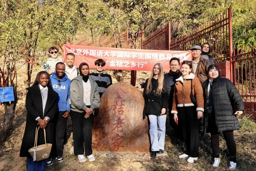 在广西柳州市融安县大将镇才妙村,留学生们在“金桔老家”合影留念。(谭凯兴 摄)