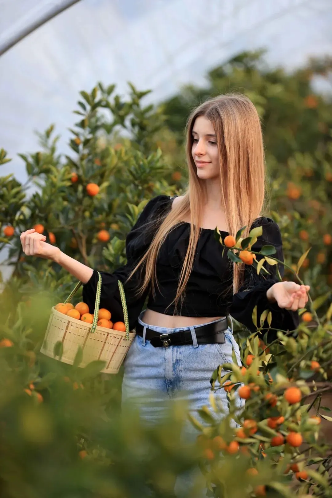 在广西柳州市融安县大将镇东潭村大潭屯,北京外国语大学留学生安吉莉卡(中文名:赵诗玥)在金桔园里体验金桔采摘。(谭凯兴 摄)