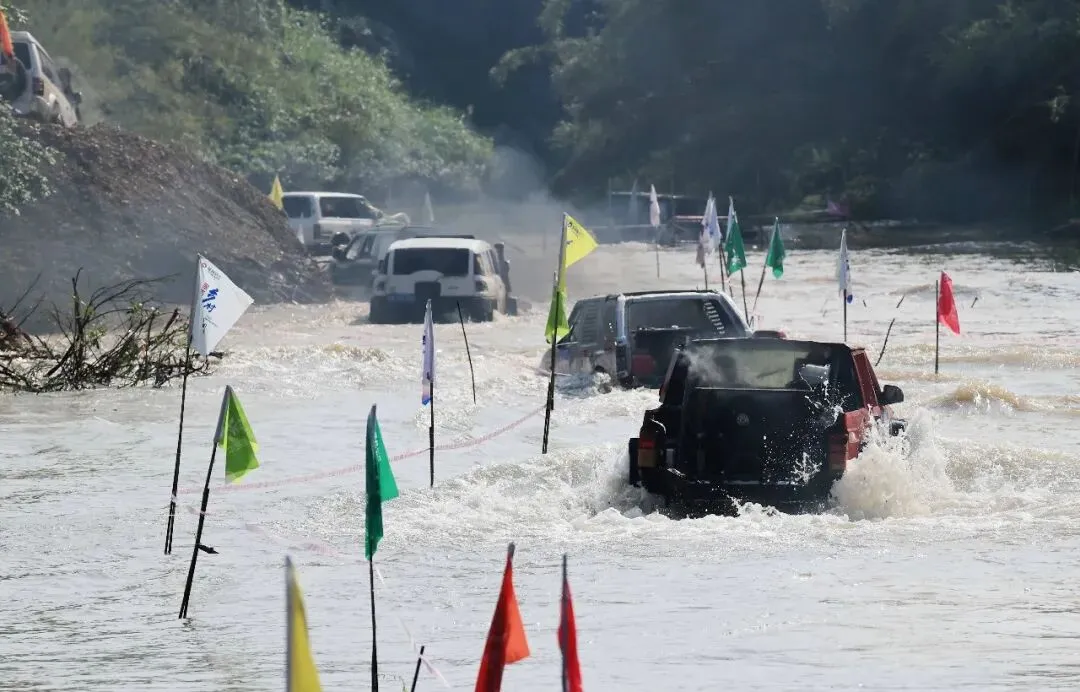 参赛选手驾驶越野汽车在广西柳州市融安县大将镇东潭村大潭屯河道上角逐。(无人机图片,谭凯兴 摄)