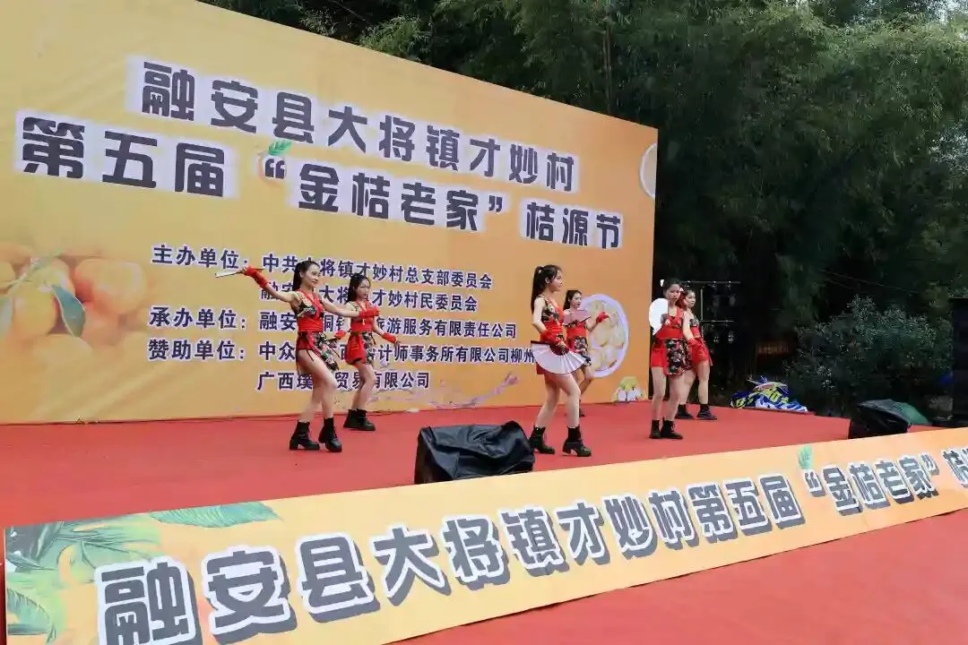 在广西柳州市融安县大将镇才妙村举办的第五届“金桔老家”桔源节上,文艺工作者在表演舞蹈。(谭凯兴 摄)