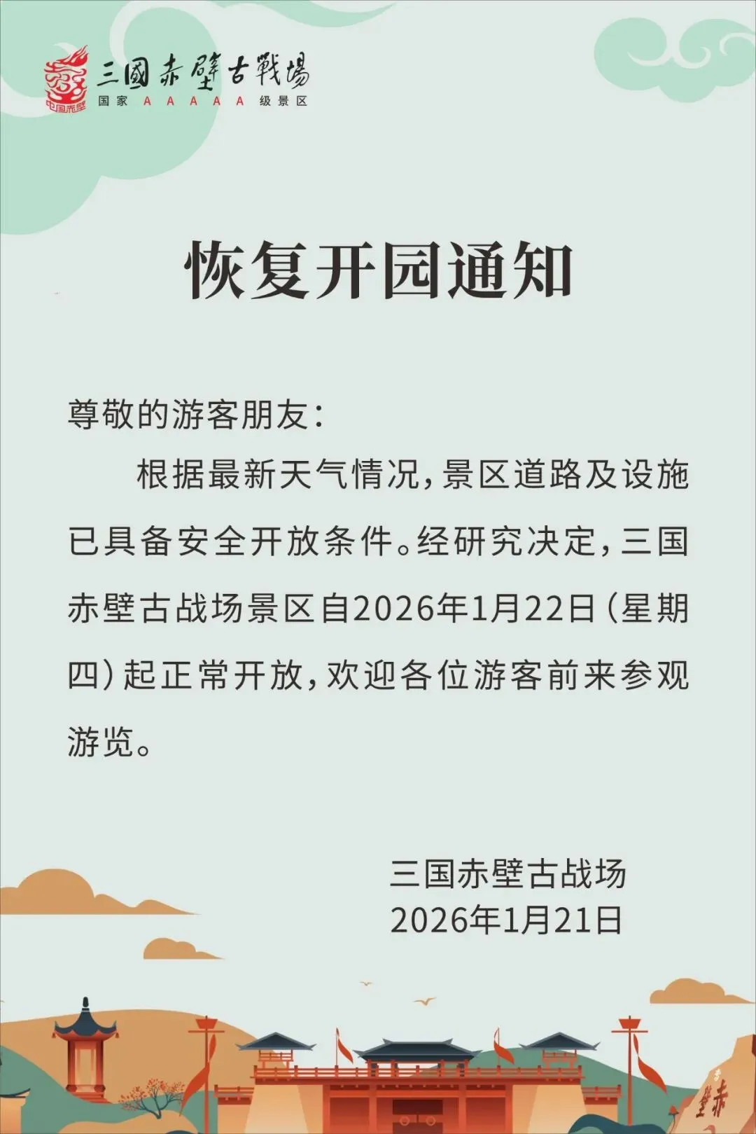 您现在的位置是:首页 > 国内旅游目的推荐 > 正文 国内旅游目的推荐 三国赤壁古战场景区恢复开园通知 admin2026年01月22日 09:08:18国内旅游目的推荐9 三国赤壁古战场景区恢复开园通知来源:三国赤壁古战场景区 转载请说明来源于"旅荐网",部分内容转载自网络,如有侵权请联系qlwl@foxmail.com删除 本文地址:https://www.15386.cn/post/84873.html 上一篇 【遇见婺女洲】秀美石门村+婺女洲·夜宿景区赏打铁花+5A丹霞地貌龟峰休闲汽车纯玩2日游 下一篇 马尔代夫旅游宝藏地 相关文章 2026年婺源旅游必看攻略:揭秘旅游费用大揭秘! 迪庆市旅行新攻略!小众场馆与特色美食,惊艳所有游客 2026年必看!拜县旅游攻略,哪家旅行社电话最靠谱? 马尔代夫最佳旅行时间|避开雨季全攻略 咸宁市旅行新攻略!小众场馆与特色美食,惊艳所有游客 河源市旅行新攻略!小众场馆与特色美食,惊艳所有游客 世界级成渝都市圈旅游发展战略咨询报告 2026年可可托海旅游新攻略:揭秘旅游地接电话热门排行! 2026年厦门跟团旅游攻略:揭秘最热门的TOP10线路 没做攻略就别来黄山旅游了,太坑了! 发表评论 取消回复 评论列表 这篇文章还没有收到评论,赶紧来抢沙发吧~