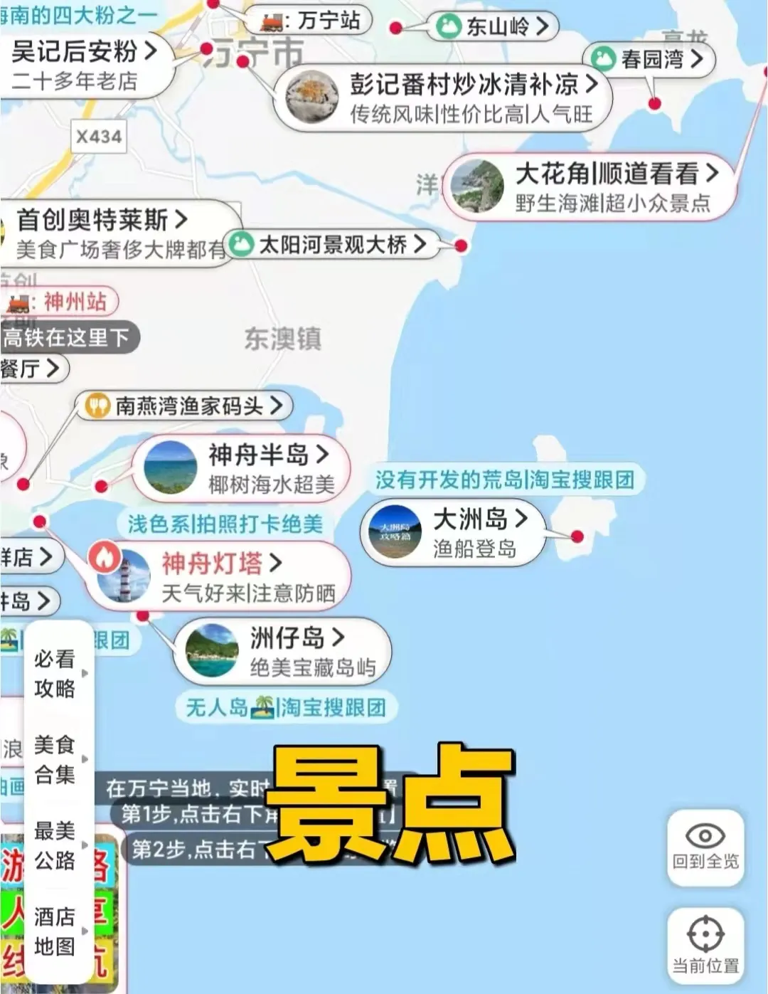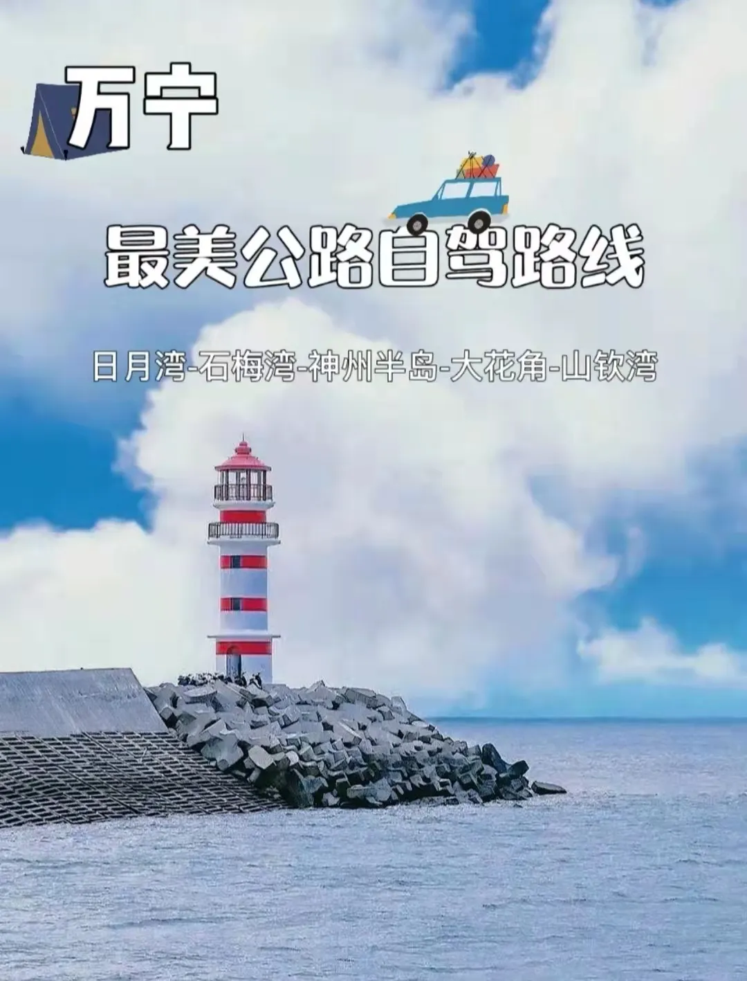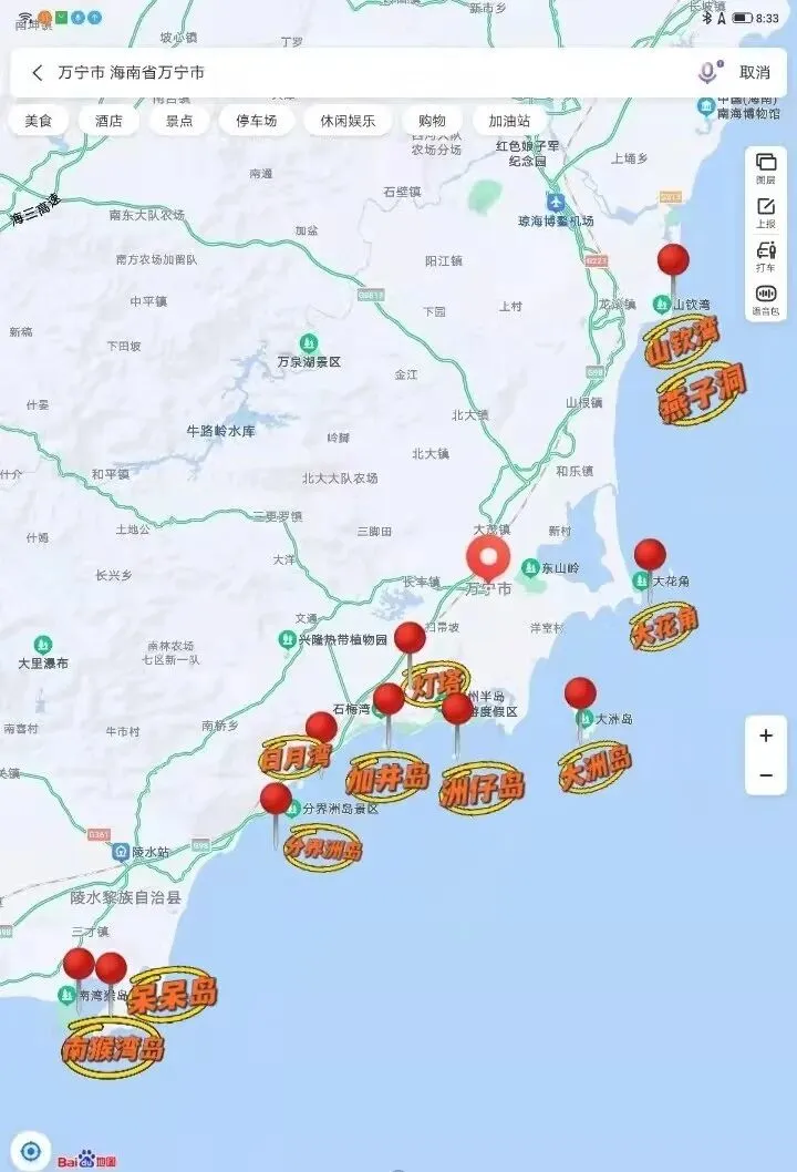 南猴湾岛→呆呆岛→分界洲岛→日月湾→凤凰九里书屋→石梅湾观海亭→神州半岛灯塔→加井岛→洲仔岛→大洲岛→大花角→山钦湾→山钦湾燕子洞
