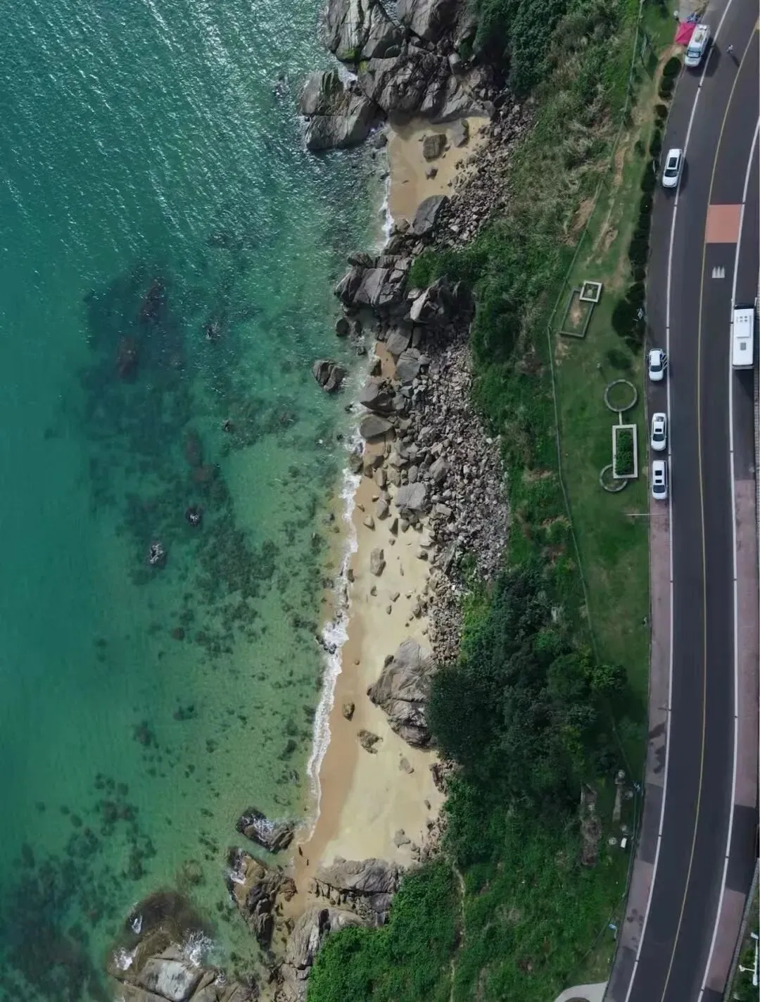这段沿海悬崖公路太好拍,一定要带上无人机,视野超级棒,一半海水一半悬崖。除悬崖公路外,石梅湾长达6公里的碧海银滩,也是诸多电影与综艺的取景地。
