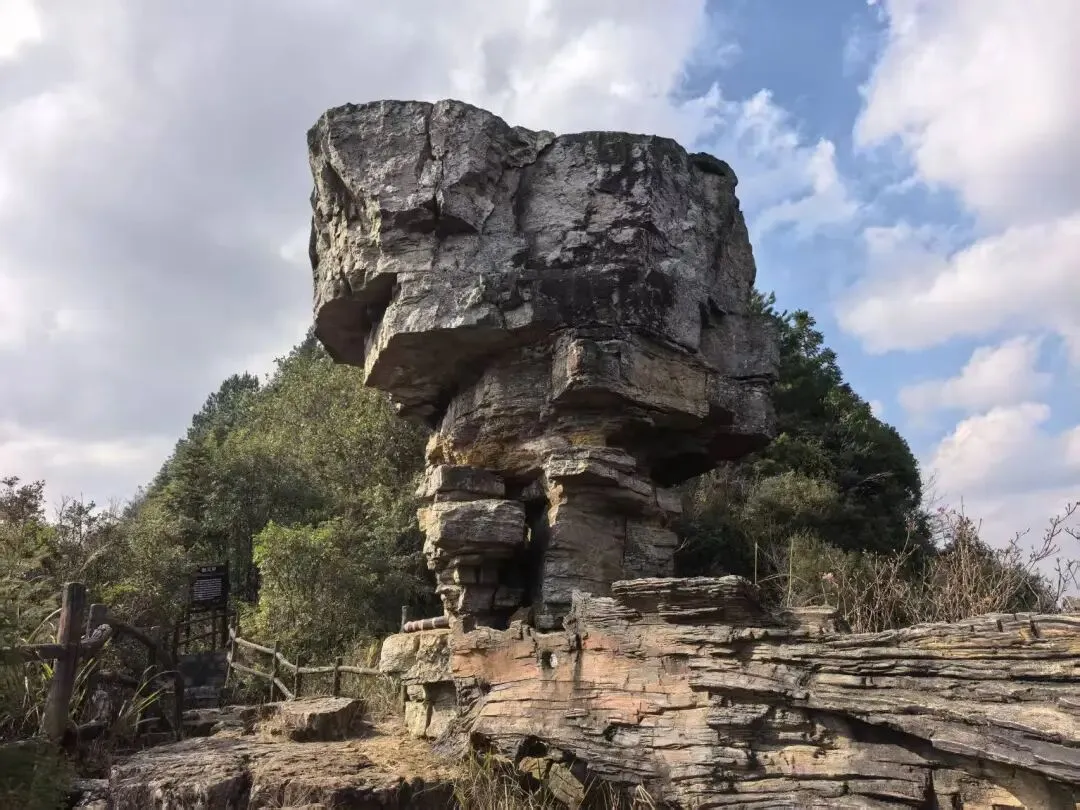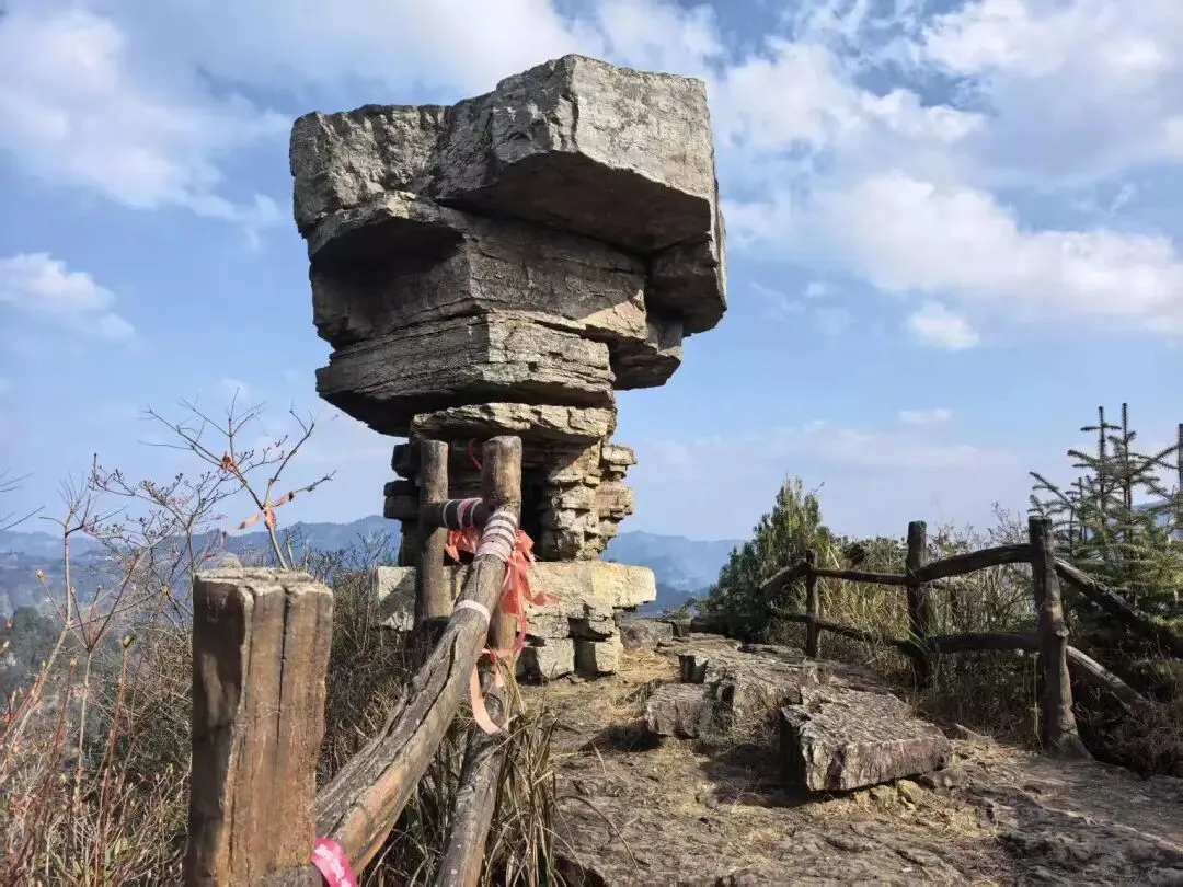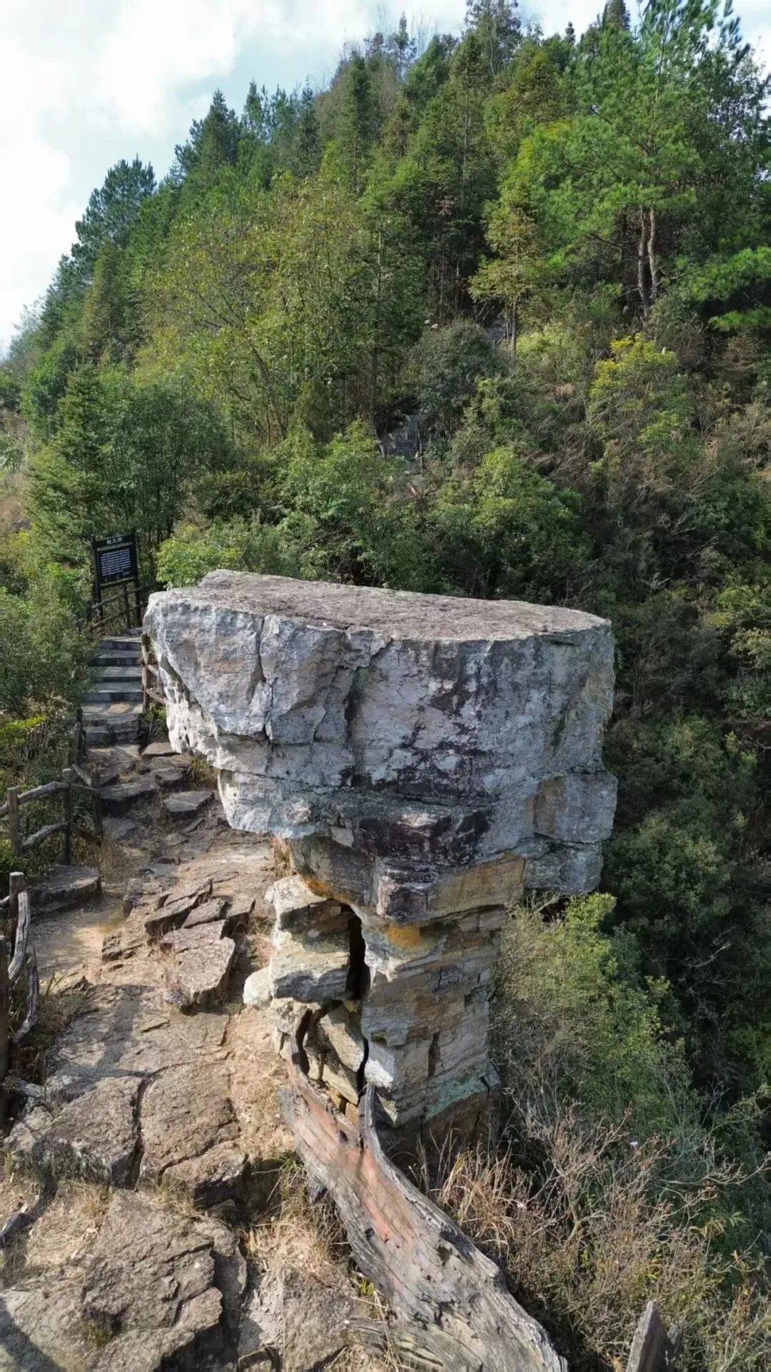1.外观形态。翻天印高约3米,上大下小,顶部为2米见方的平台,下部最小处仅有二人合抱大小,近看好似一朵巨型平菇,远观则如一枚朝天大印,其印面是一块方方正正的平滑巨石,造型奇绝壮观。翻天印四周都是悬崖峭壁,非常险峻,一眼望去,都是万丈深渊,这里是拍照打卡的好地方。