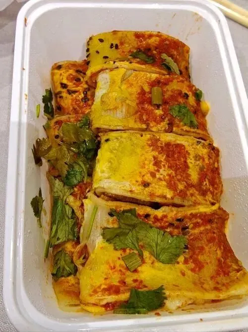 烤冷面这东西,东北遍地都是,但鞍山的口味略甜。铁板上刺啦一声,鸡蛋摊开,冷面往上一贴,刷酱、撒葱花香菜、卷起来切段儿。咬下去外焦里嫩,嘴里又甜又辣,吃完嘴唇发麻,还想在来一份。街边摊子6块钱一份,加肠加蛋也就10块出头。