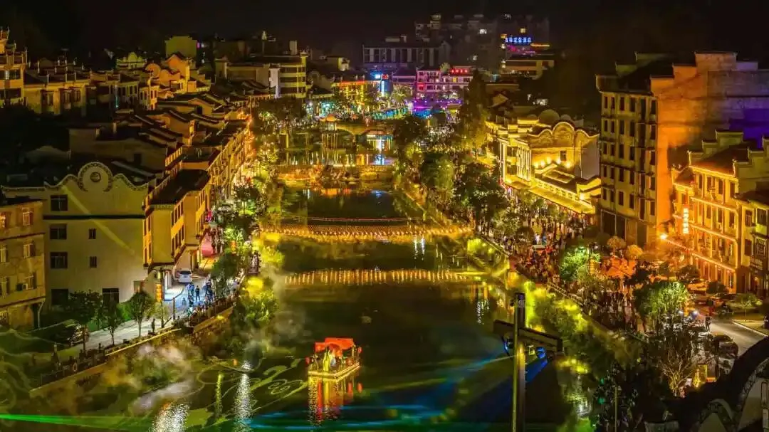 晚餐后邂逅《梦回鸠兹》行进式光影秀,灯光映着徽派建筑,河道间剧情流转,置身“人在画中游”的梦幻场景。