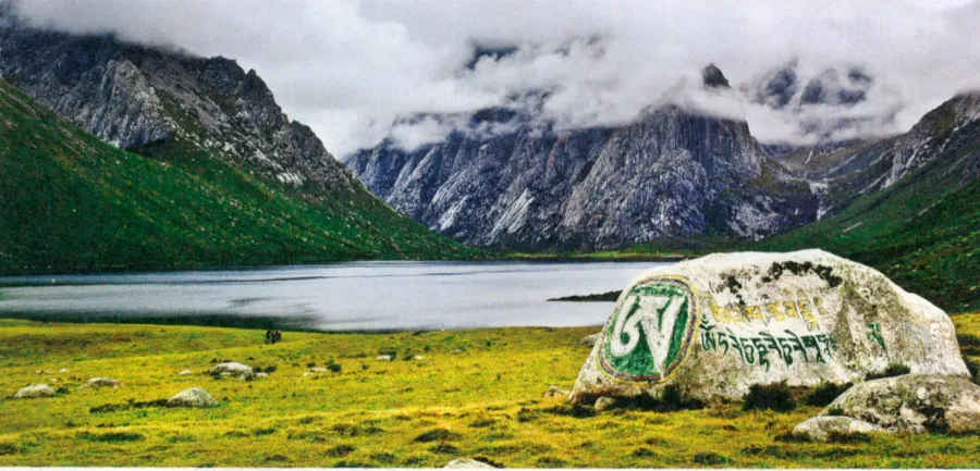 仙女湖的北面有一条百余米长的细流通向妖女湖。不同于仙女湖的沉静安详,这片湖泊更为艳丽,更为妖娆,也更狭长。 据说湖水有三种颜色,比仙女湖多一色,更显得妖娆多姿。传说妖女湖很有特点,白天晴空万里,夜晚狂风暴雨,雨后繁星满空,全在一夜间经历。 四季中,景色各异,感受迥然相异, 在盛夏里尤为明显, 在同一天能够领略到春夏秋冬四季之变迁。 夜晚满天星斗,寒气逼人,俨然隆冬景象; 清晨,当一轮红日从东方冉冉升起时, 整个山体被浓雾弥漫, 不久便是金色的阳光洒满大地,碧空如洗; 上午,山上浓云密布,下起倾盆大雨; 正午时分,云开雾散,烈日炎炎, 回到了盛夏的酷暑季节; 午后,突然狂风四起, 雷鸣电闪,冰雹从天而降; 傍晚时分,夕阳西下, 草原完全恢复了昔日的宁静。 除了冷峻的山峰和明镜般的湖泊 这里还流传着格萨尔王的故事 壮观的冰体与鬼斧神工般陡峭的山岩 更使它披上了一道神秘的面纱 这里每一座山峰