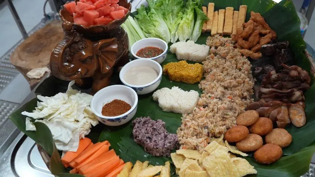 手抓饭配上烤肉和各种蘸料
