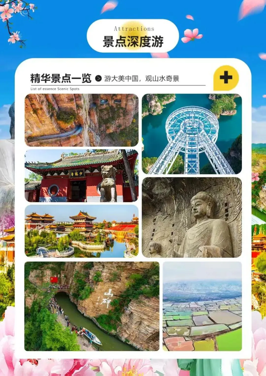 运城地坑院/龙门石窟/禅宗音乐大典/少林寺/清明上河园/小宋城/宋都御街/殷墟博物馆/红旗渠/郭亮村/峰林峡/黄河三峡/七彩盐湖/永乐宫/关帝庙