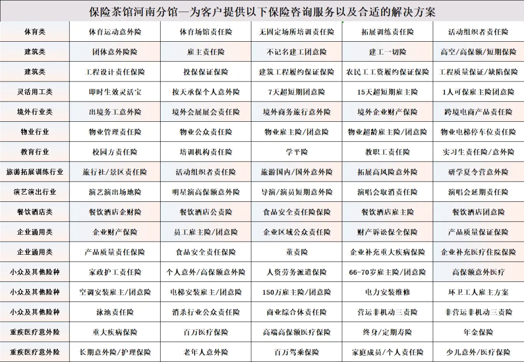 主营宣传推广方案;雇主责任险,团体意外险,出国人员团体意外险,建工险,企业财产保险,公众责任险,物业管理责任险,体育运动意外险,明星演员高保额意外险,专业赛事保险,体育场馆责任险,装修建工一切险,装修不记名团意,装修人员保险,灵活用工保险,旅游意外险,拓展训练意外险,质量保证保险,诉讼保全保险,食品安全责任,等等。公司以企业客户、渠道客户需求为向导、推荐全网平台最合适的方案服务大家,做最好的经纪服务