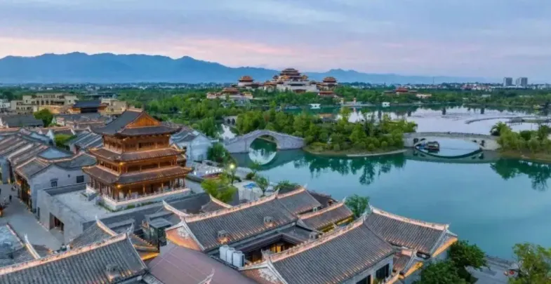 这就是兴汉胜境,位于陕西省汉中市汉台区诸汉路中段,是一处以汉文化为主题的大型山水楼阁景点。