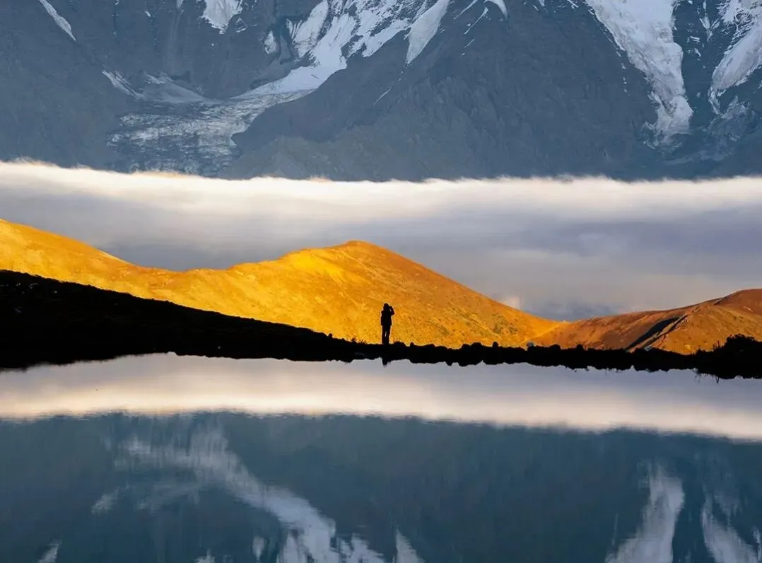 同一个世界,在他的取景框里,人群消失了,只剩下塔的倒影在金色湖面上微微荡漾。