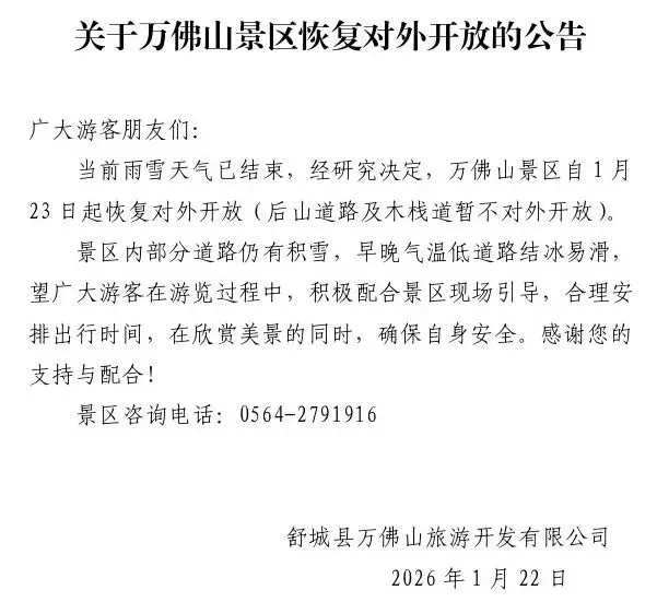 结合天气预报情况,经研究决定,万佛湖景区自2026年1月22日起恢复对外开放。