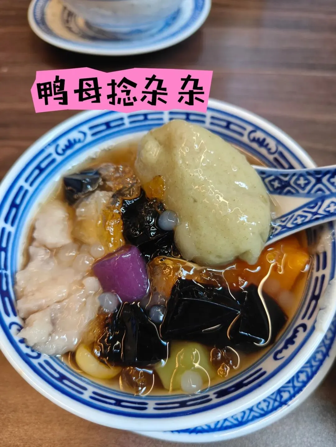 在小红书上看到有美女在潮州一面大红墙打卡的照片,对于爱拍照的我来说心心念的不想错过,于是按照定位一路找去,问了一家生腌店的店员才知就在旁边的巷子里。一面红墙上面写着“潮州府城”四个黑字,调好角度,打卡留念。巷子尽头有家甜品店坐满了人,大家正好又累又饿,便坐了下来,买了四碗“鸭母捻杂杂”,就是糯米皮包裹的豆沙、芋泥等甜馅的汤圆,配以芋圆、鹌鹑蛋、银杏、姜薯等配料,软糯可口,香甜不腻。小陈又买来了昨晚没吃成的腐乳鸡翅,用腐乳汁腌制过的鸡翅裹上面粉油炸,有股淡淡的腐乳味,香酥软烂,非常好吃。