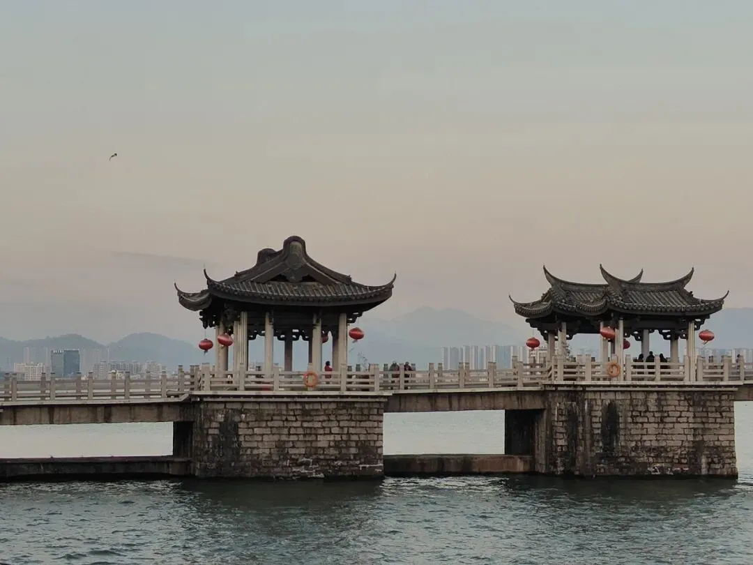 17:30广济桥有“过河拆桥”仪式,于是小憩过后,我们四人随着人流朝江边走去,江边栏杆旁已站满了游客,里三层外三层,好在我个子高,找个了空隙,能看到广济桥。 广济桥是中国四大古桥之一,以其“浮梁结合”的结构闻名。桥长约518米,东西两端为石梁桥,中间一段由18只木船连接成浮桥,是世界上最早的启闭式桥梁之一。每天17:30浮桥部分会被拆开,次日上午再重新连接,形成“白天连桥通行,夜晚拆桥通航”的规律。 只见两艘大船驶来,工作人员走上浮桥解开连接处,扣上大船,大船分两边将浮船拖走,整个拆桥过程大概半个小时,现场人多视野不开阔,远没有在视频上看的壮观,建议上网搜索观看无人机角度拍摄的视频,比现场好看多了。