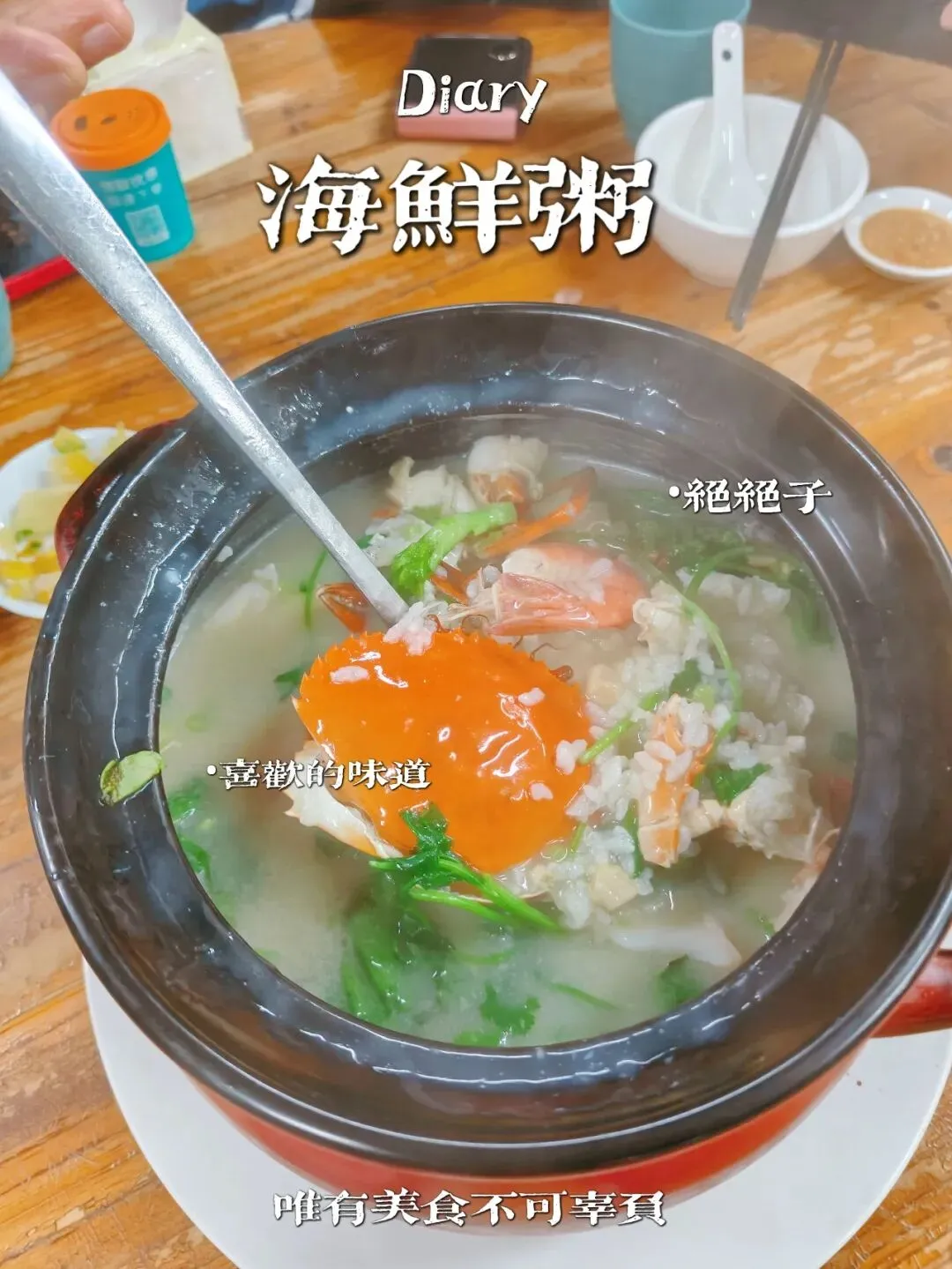 看过“过河拆桥”,我们从下水门附近登上城墙,脚下是厚重的城砖,身旁是古老的城门楼阁,华灯初上,城墙与城楼灯火璀璨。成为潮州最动人的夜景。 潮州古城,古城墙、古府第、古民居楼随处可见,可是古城不古,历史与现代交融,充满了活力。 晚上,我们要去打卡另一个美食街——珠江路美食。来到珠江路正无从下手不知到哪吃,看到路边停着一辆警车,一位警察叔叔坐在里面,小陈小李上前询问哪家海鲜粥好吃,警察耐心地帮我们查询了店家的名字,于是我们找到了这家“普宁砂锅粥”,这家店生意非常好,门口坐满了人,还不断有人来点餐。我们点了一份300元的海鲜粥,里面有蟹、有虾、有象拔蚌。一大砂锅海鲜粥,你一碗我一碗被吃个精光,非常鲜美。